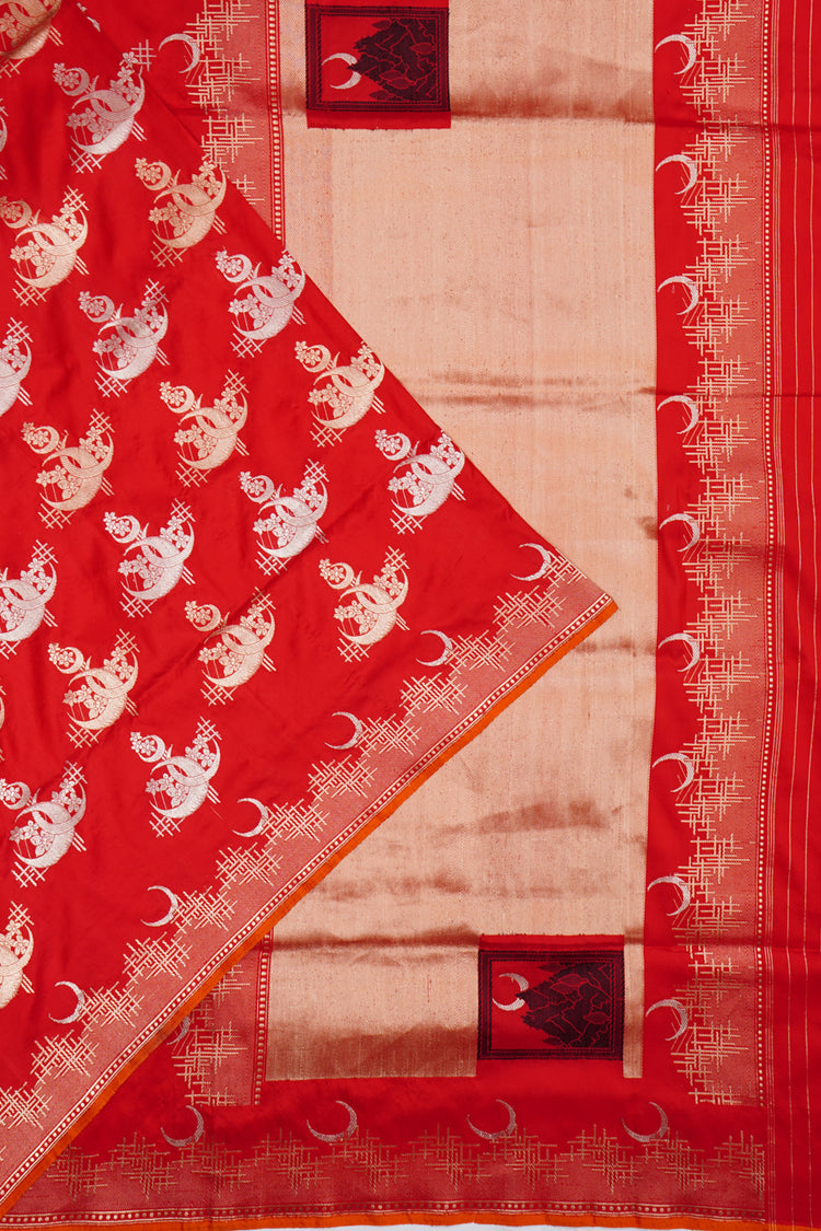 The body is designed with gold and silver zari butta featuring intricate half-moon motifs with florals, giving the red saree a unique and luxurious appearance.