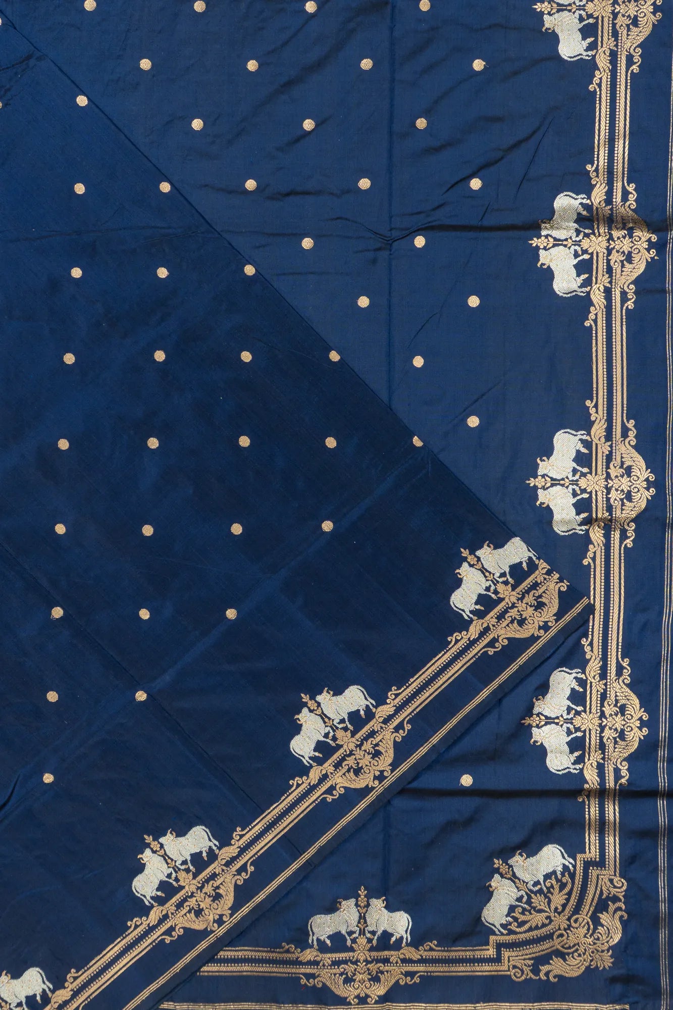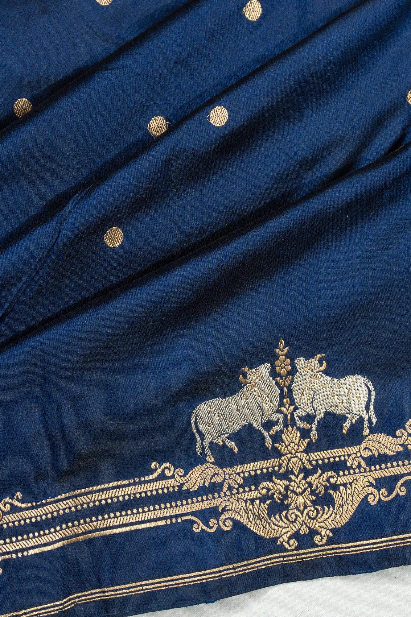Adorn yourself in the regal beauty of the Banarasi Silk Butta Royal Blue Saree, a masterpiece of traditional artistry The saree's body is embellished with gold zari polka dot buttas, creating a delicate shimmer against the rich royal blue silk