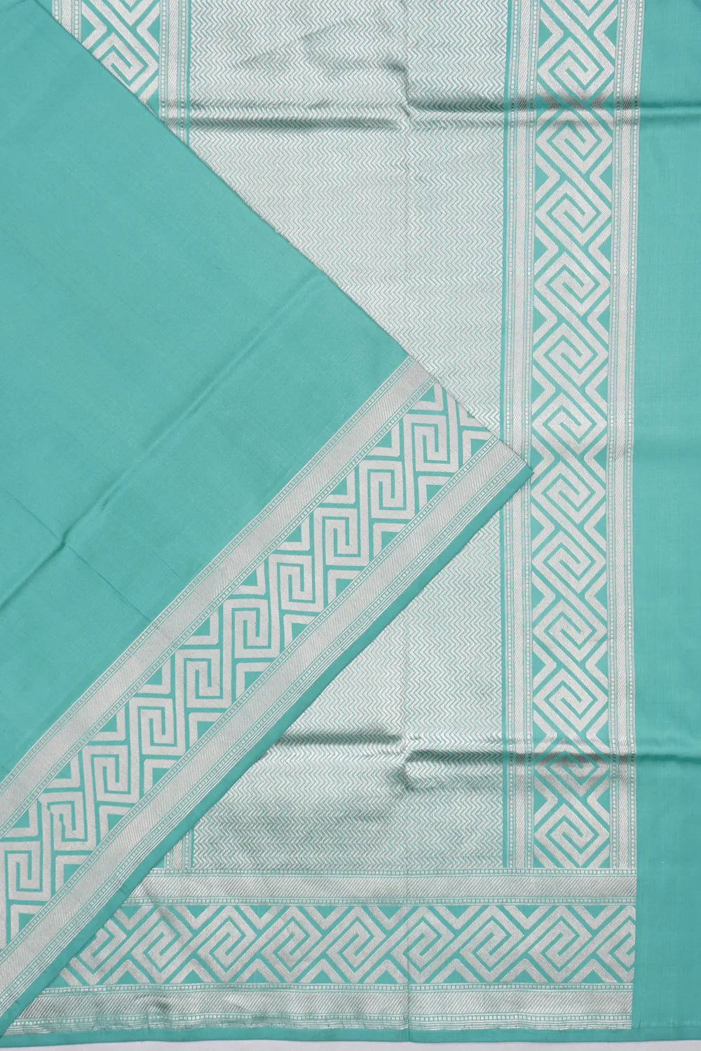 The saree’s body is adorned with delicate zari buttas, casting a subtle shimmer against the serene sea blue backdrop, while the self zari small border adds a touch of understated elegance