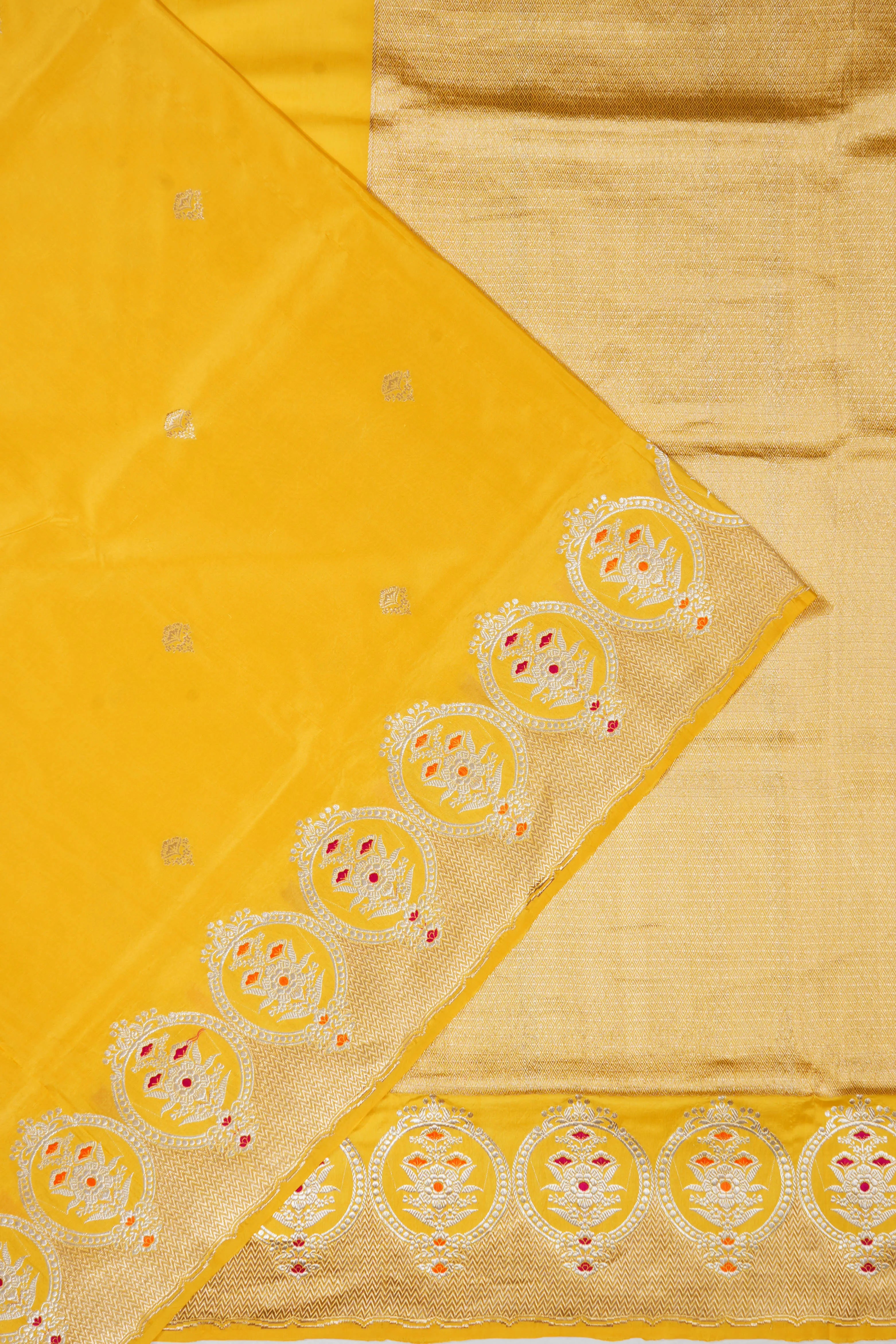 A vibrant yellow base featuring exquisite gold zari floral buttas, creating a harmonious blend of tradition and elegance.