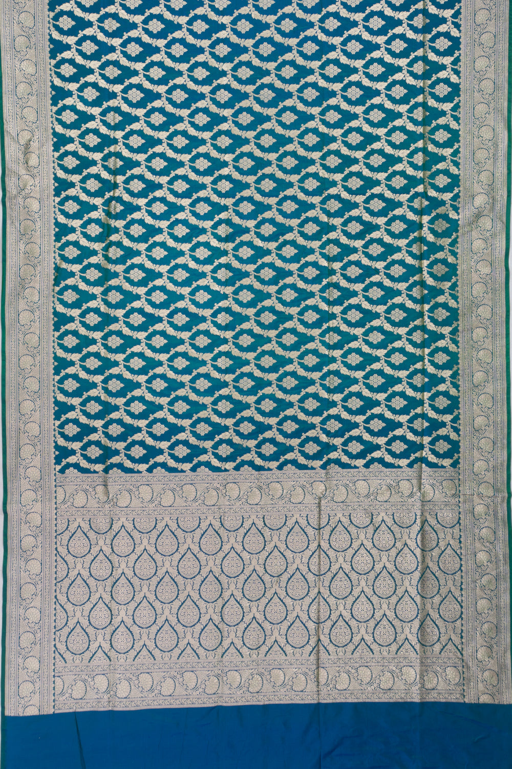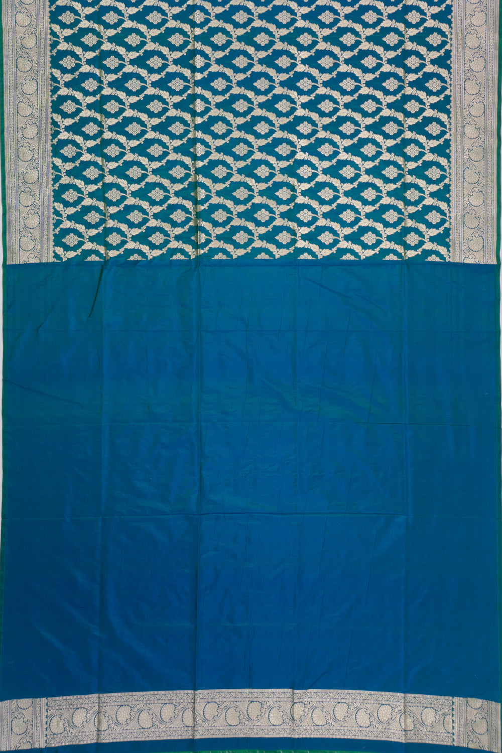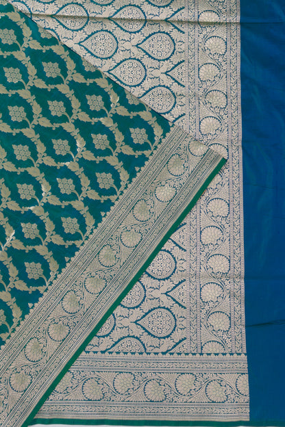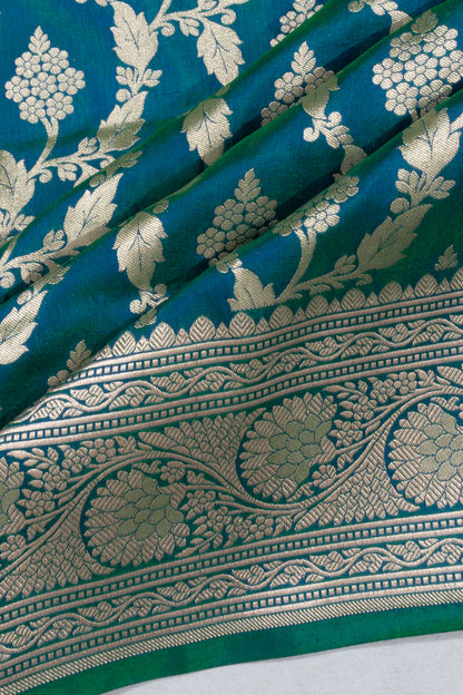 A striking dual-tone Silk base in blue and green, featuring all-over gold zari floral jaal that radiates traditional luxury.