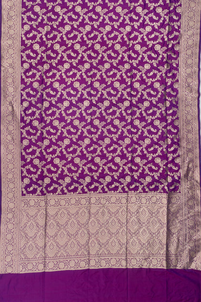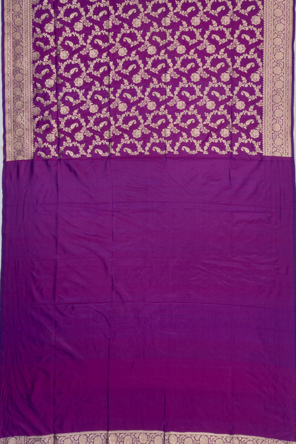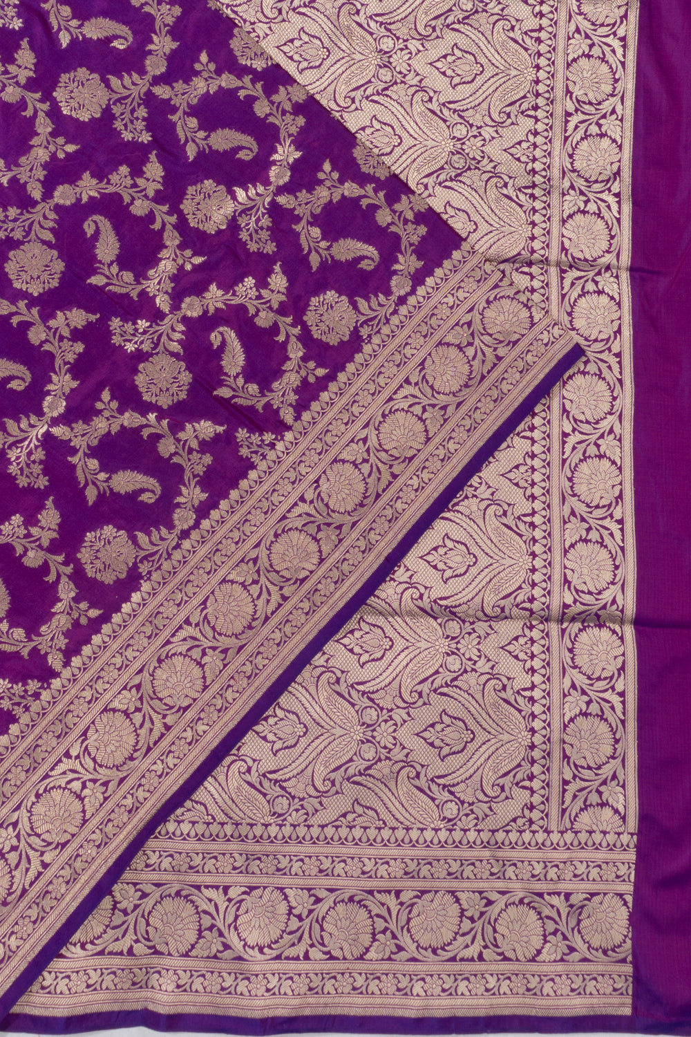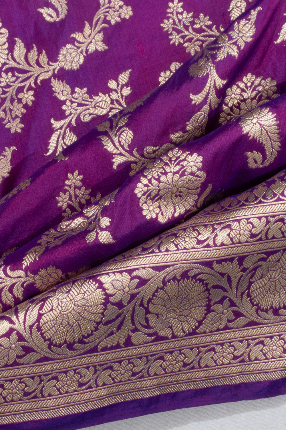 Gold zari floral jaal intricately woven over a rich dual-tone purple and violet Silk base, creating a subtle interplay of shades with delicate floral motifs.