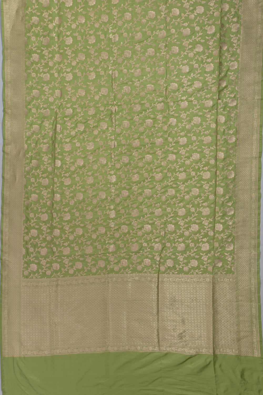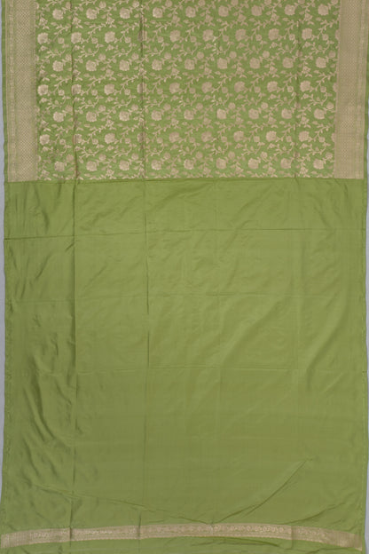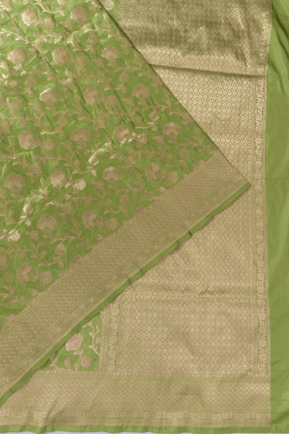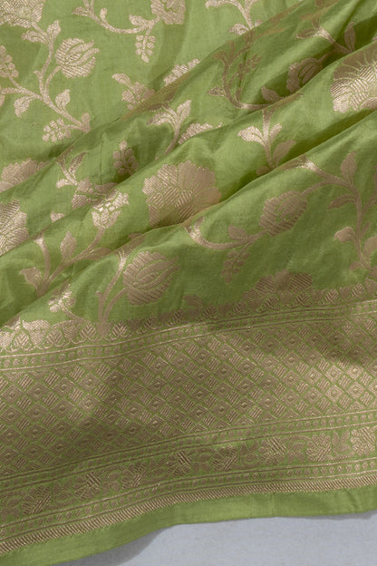Rich green Silk showcases an all-over gold zari floral jaal, exuding timeless elegance.