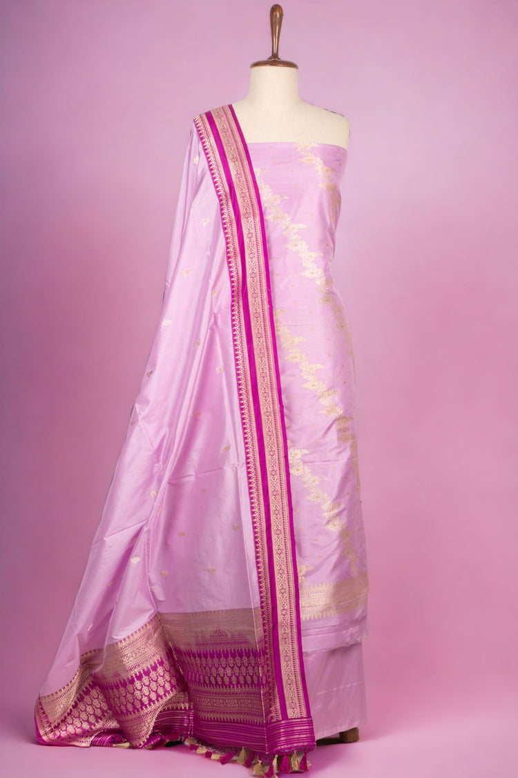Step into the limelight with the Banarasi Silk Unstitched Salwar Suit Set in Lavender, showcasing a top adorned with contrast gold and silver zari jaal and gold zari brocade medium border The plain bottom, designed for customization, allows for personalized styling The ensemble is completed with a captivating purple dupatta featuring contrast gold and silver zari floral butta and gold zari brocade medium borders This set, inclusive of top, bottom, and dupatta, is a celebration of traditional craftsmanship and contemporary aesthetics