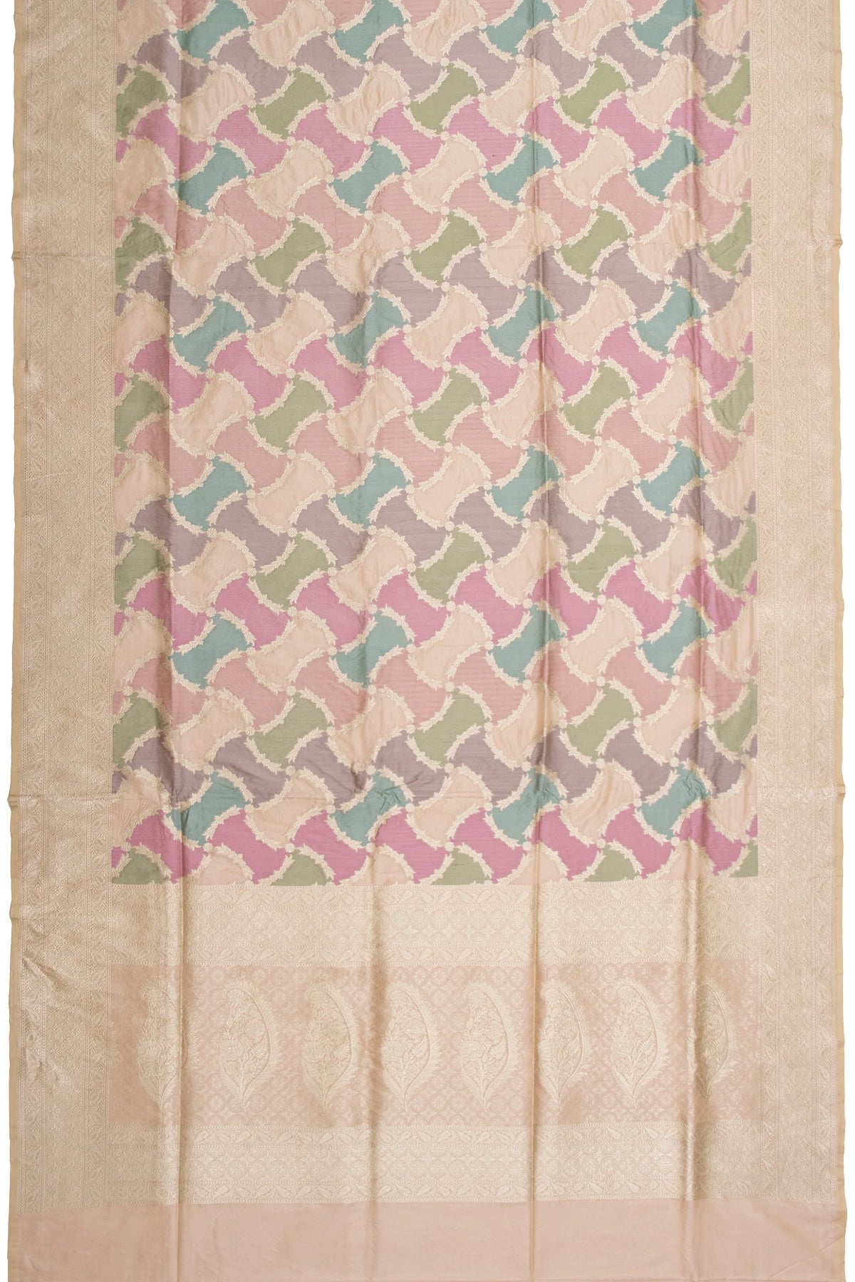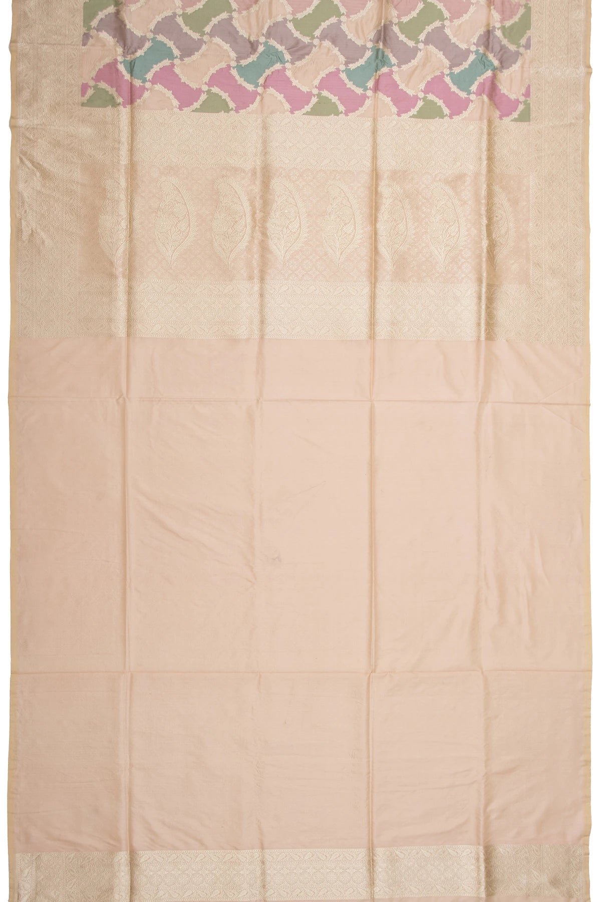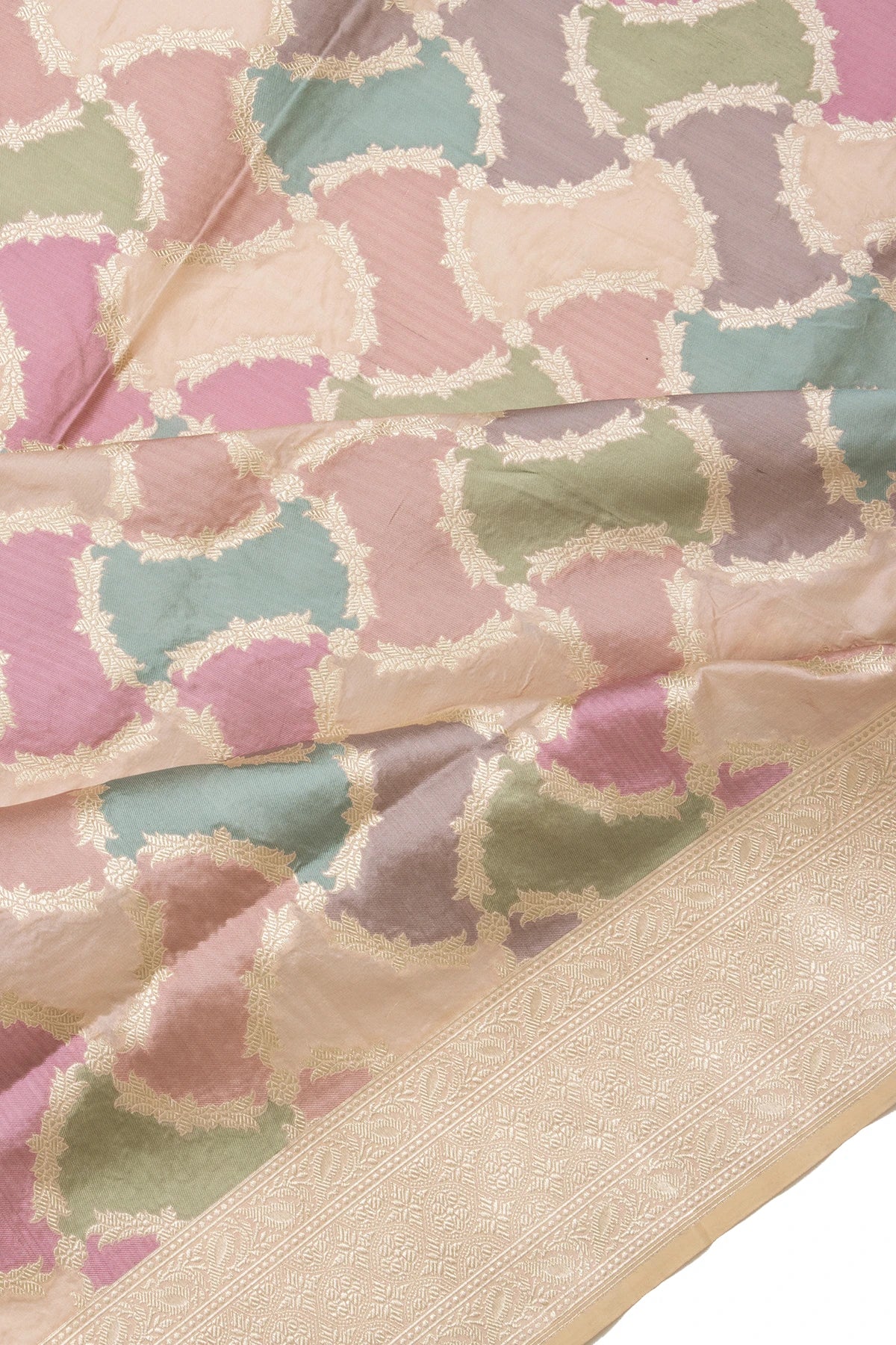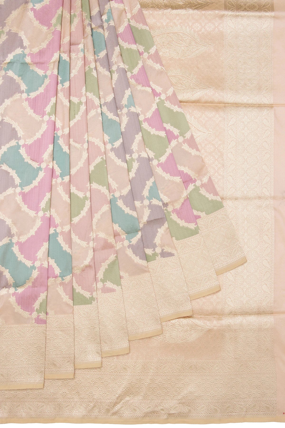 Gold zari floral jaal woven intricately over a soft peach base, offering a delicate yet luxurious look.
