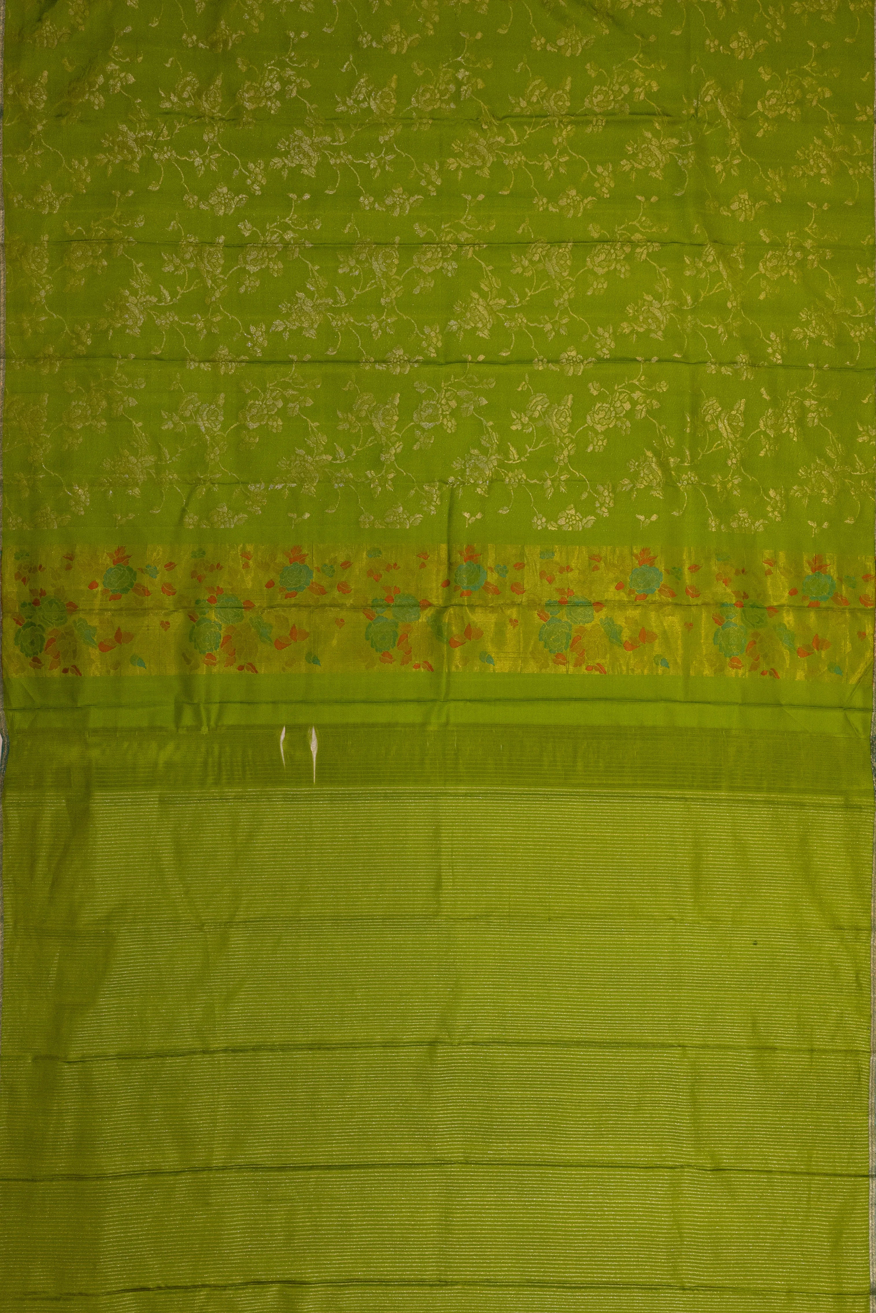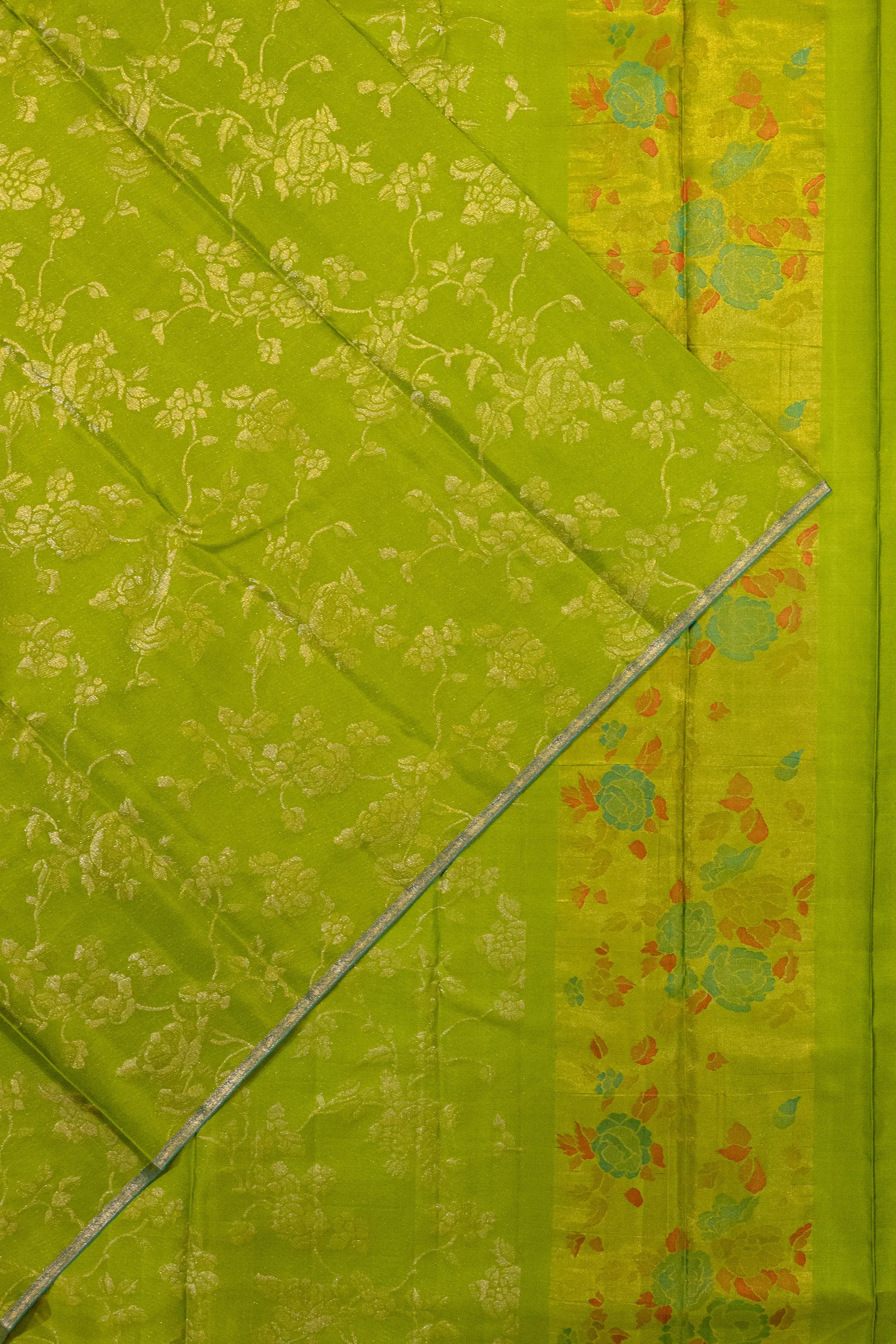 Accompanied by a self gold zari tissue pallu, this saree features intricate floral vines that add a touch of opulence to its graceful drape