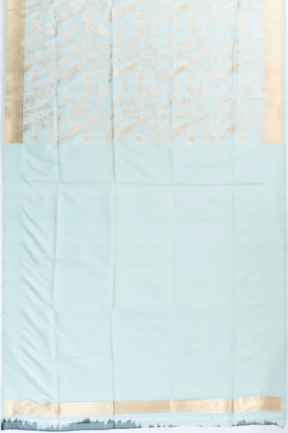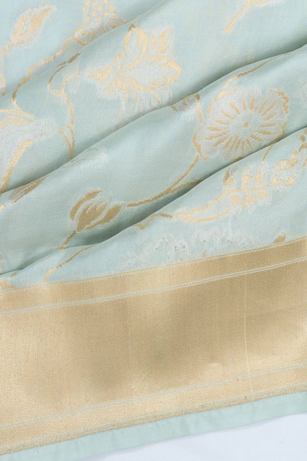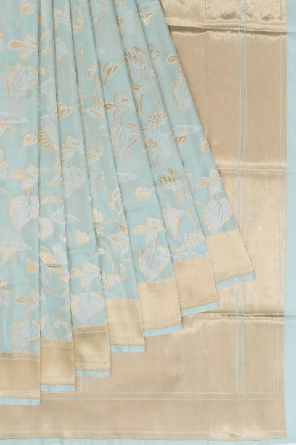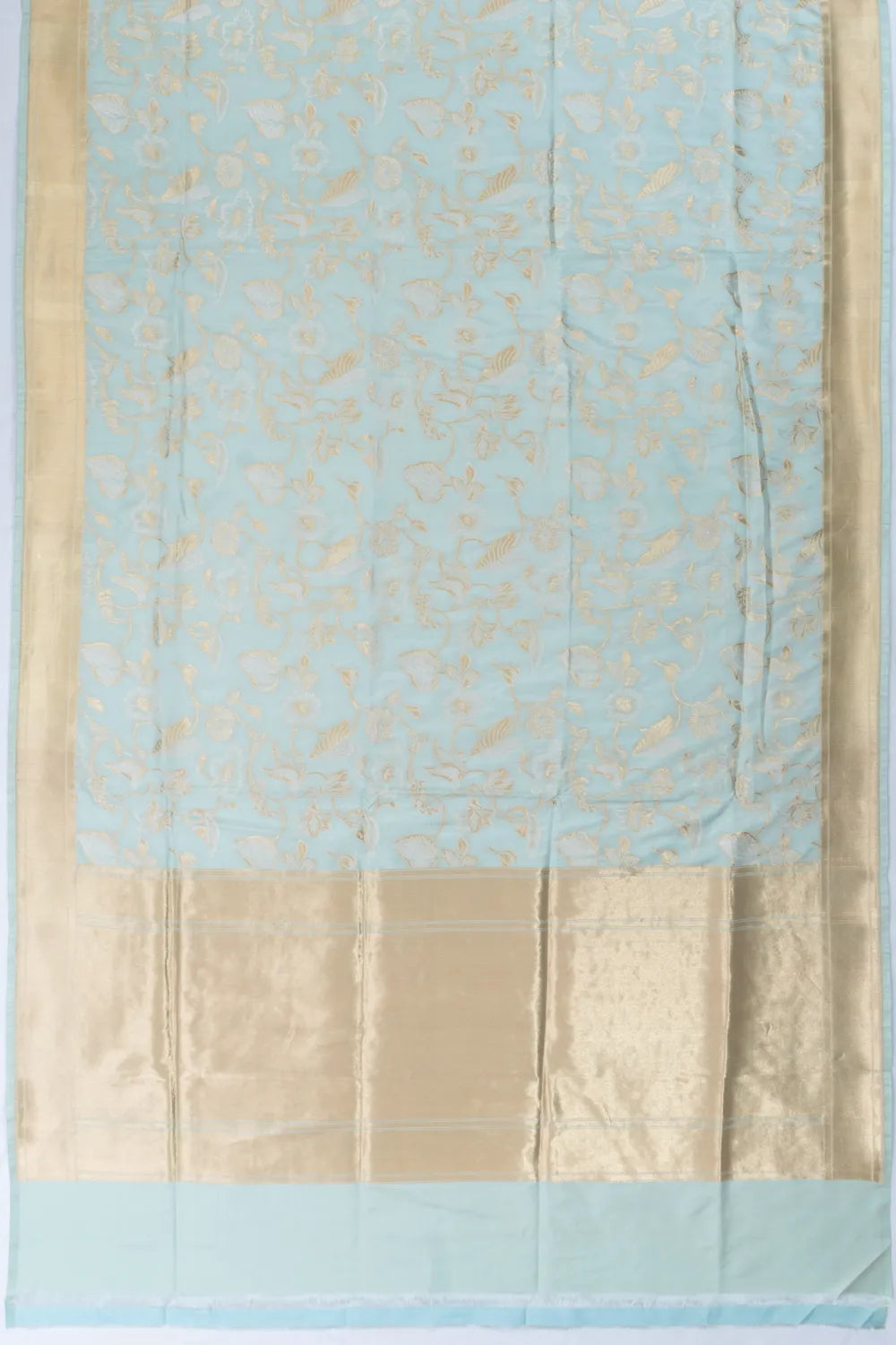 A serene Pastel Blue Banarasi Silk saree graced with an all-over gold zari floral jaal, exuding breezy elegance and traditional artistry.
