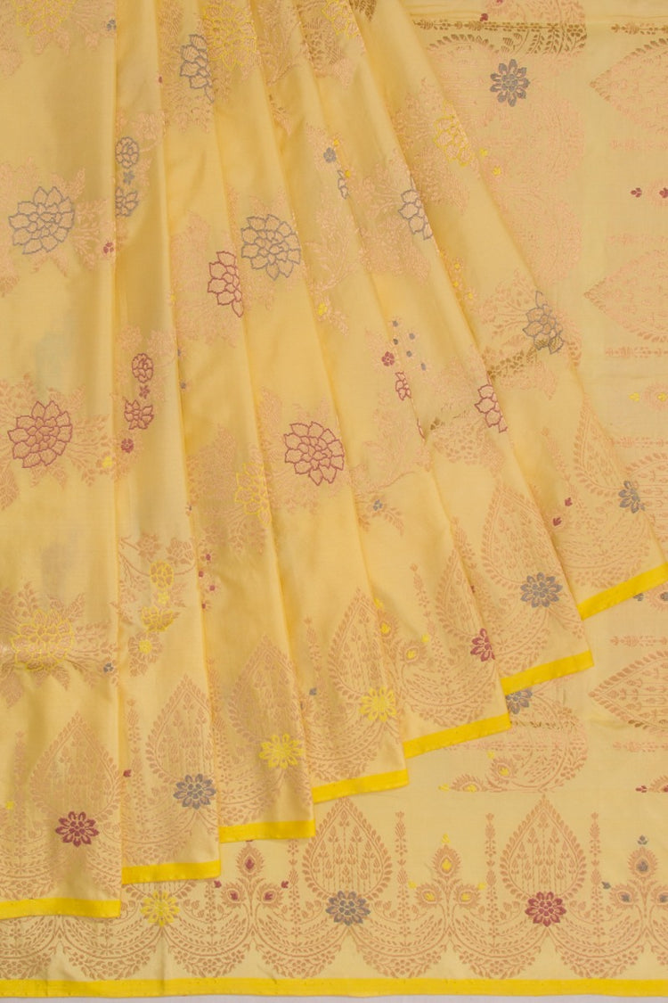 The soft, pastel-yellow color adds a touch of elegance to any occasion Made from high-quality Banarasi silk, this saree drapes beautifully and feels luxurious against the skin The intricate jaal pattern adds a unique charm to the saree, making it a must-have in your wardrobe Perfect for weddings, parties, or festive celebrations, this saree will make you stand out from the crowd