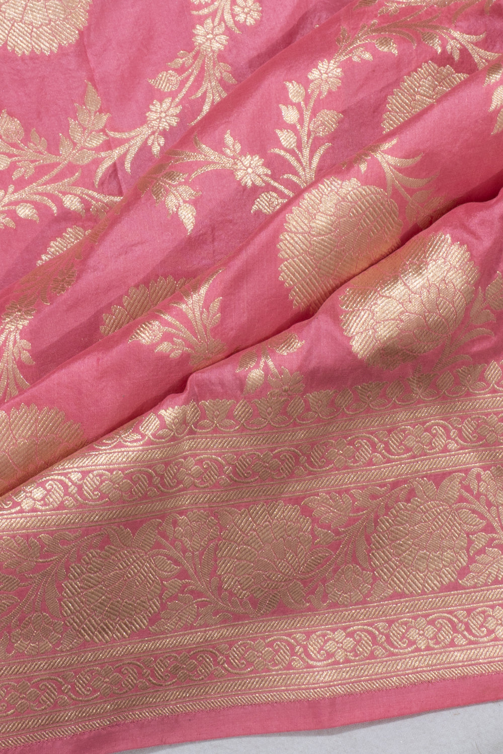 The pink Silk body is adorned with delicate gold zari floral jaal, creating an intricate and elegant texture.