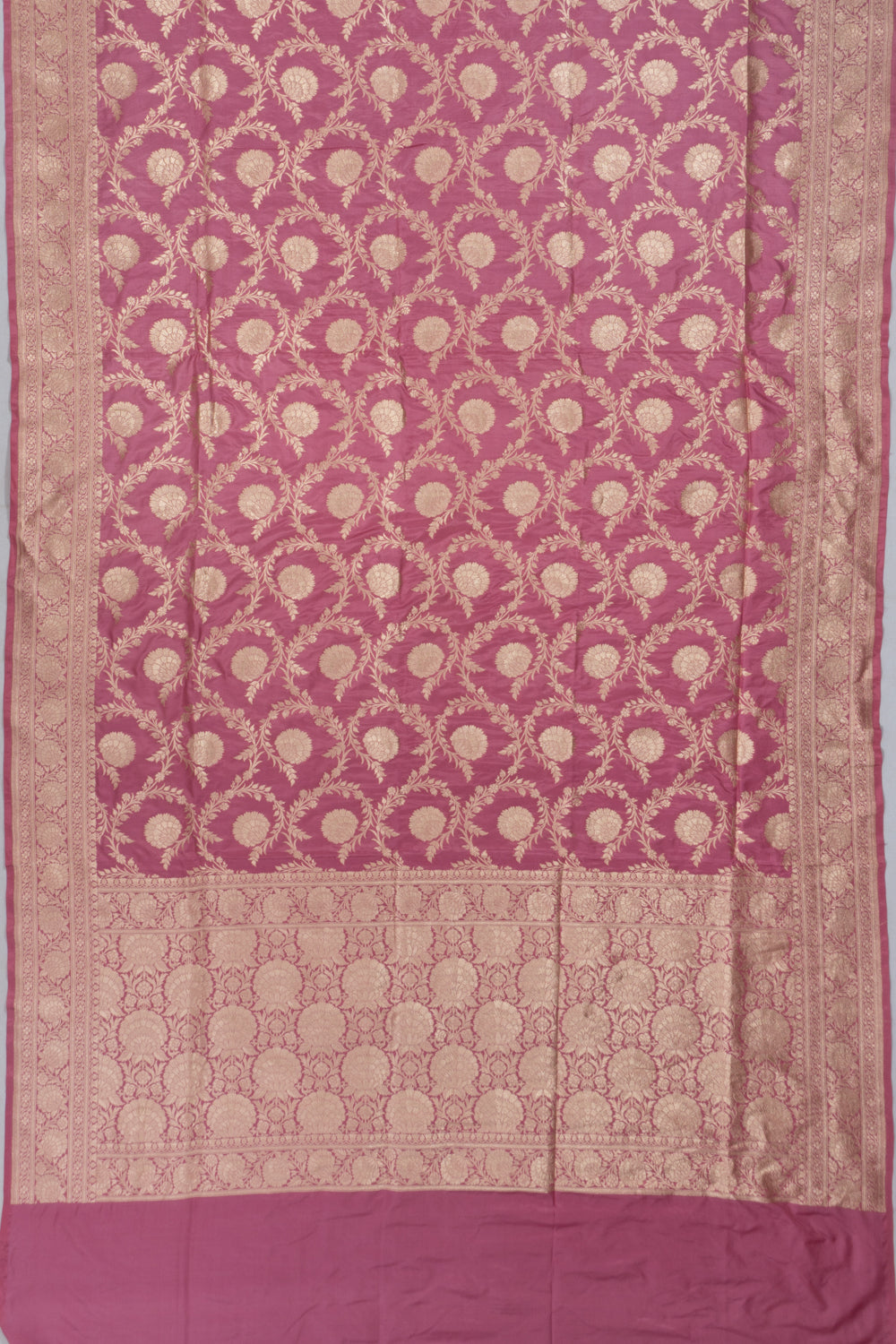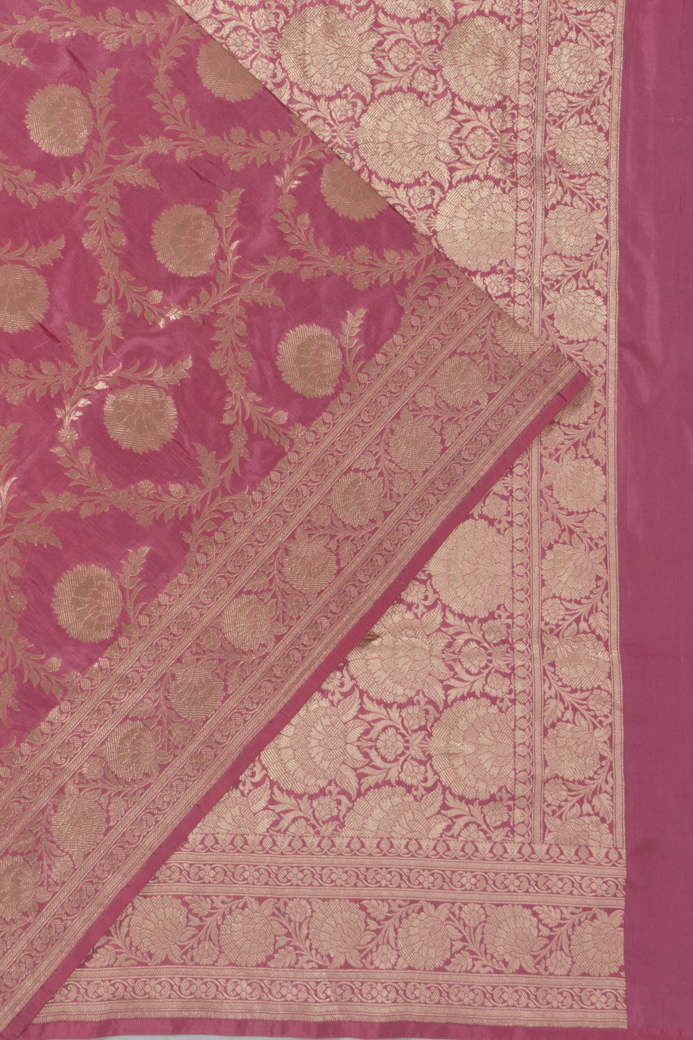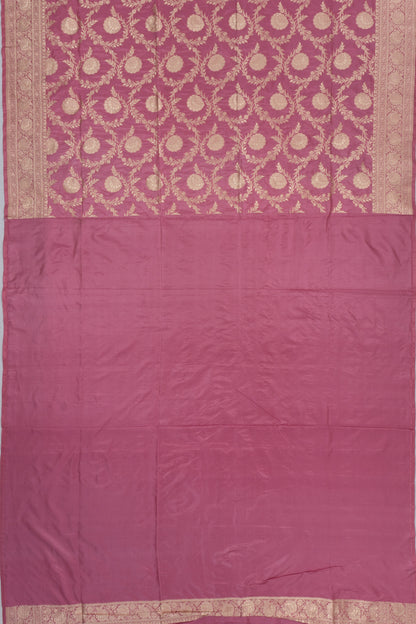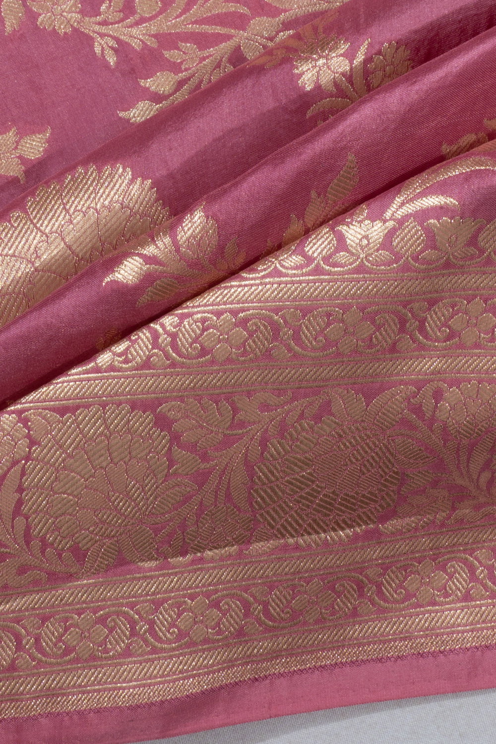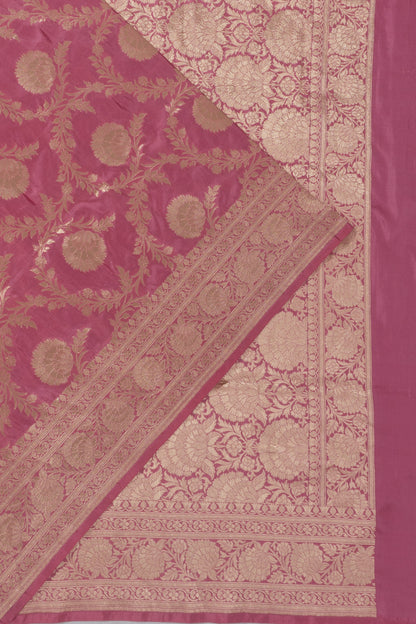 Elegant floral jaal woven with gold zari over a pink Silk base, showcasing traditional Banarasi craftsmanship.