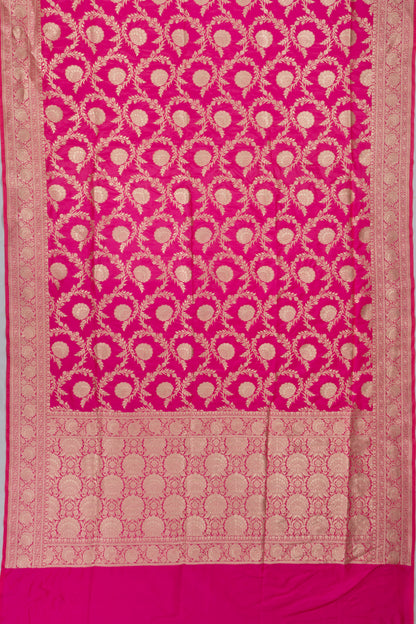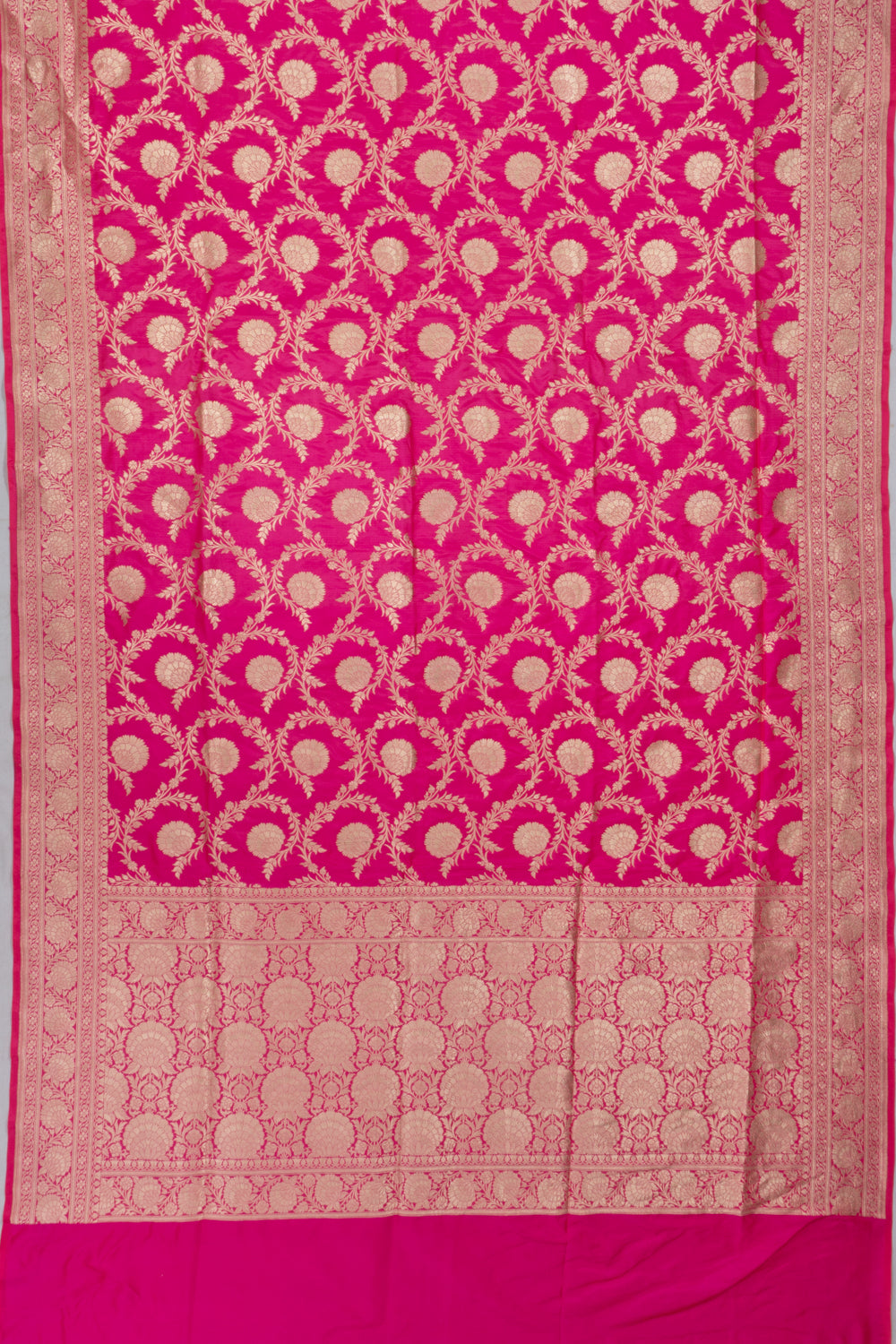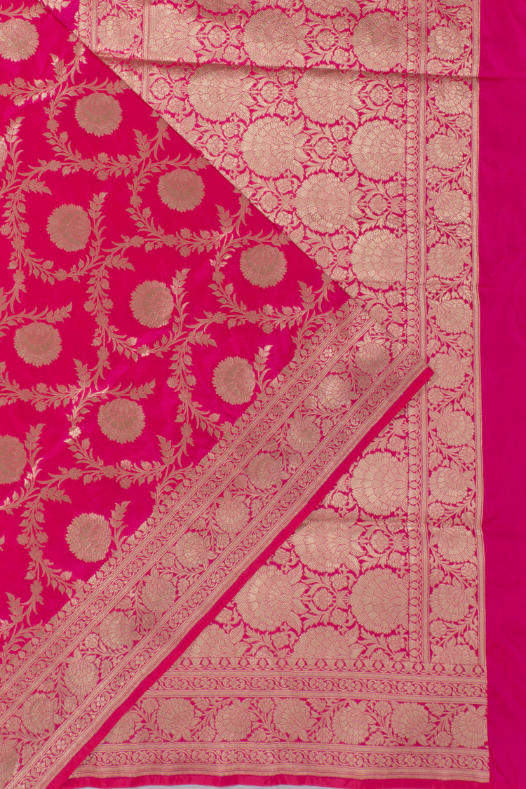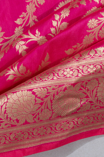 Gold zari floral jaal intricately woven on a vibrant rani pink Silk base, featuring delicate floral motifs that shimmer beautifully.