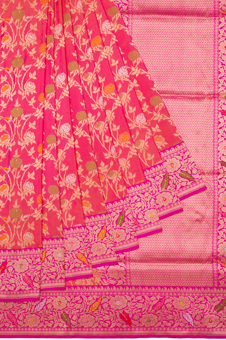 Contrast gold zari floral brocade medium pink border with multicolour Meenakari, adding depth and contrast.