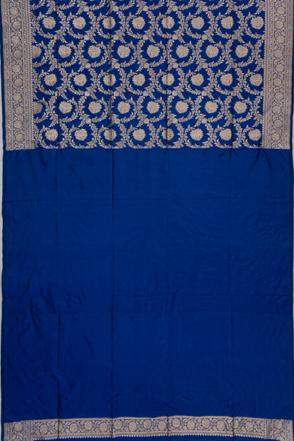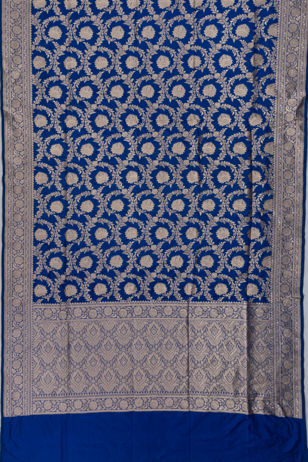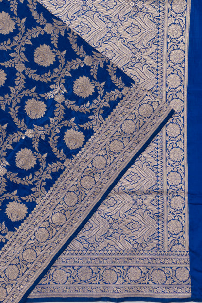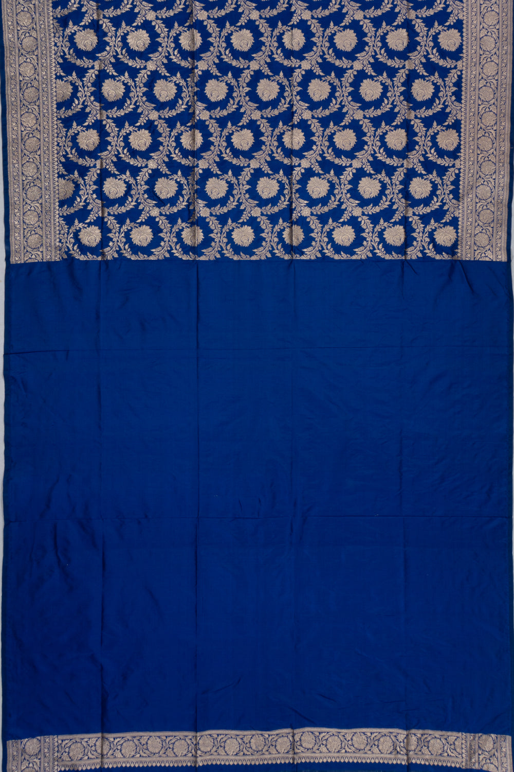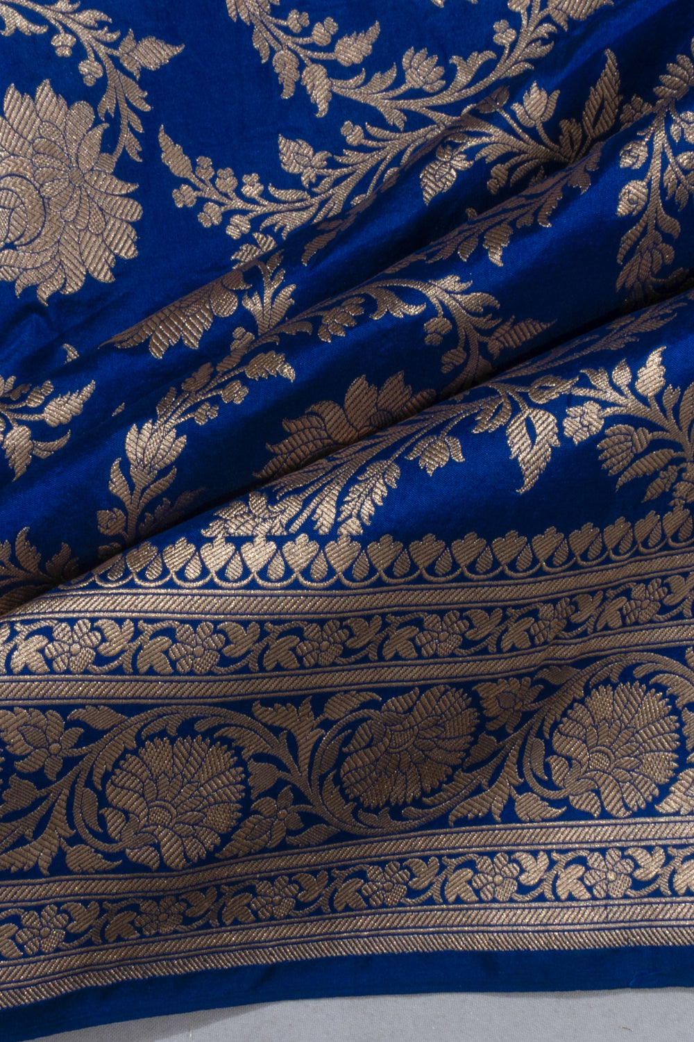 The body of the saree features a rich royal blue base adorned with intricate gold zari floral jaal, lending it a timeless and elegant appeal.
