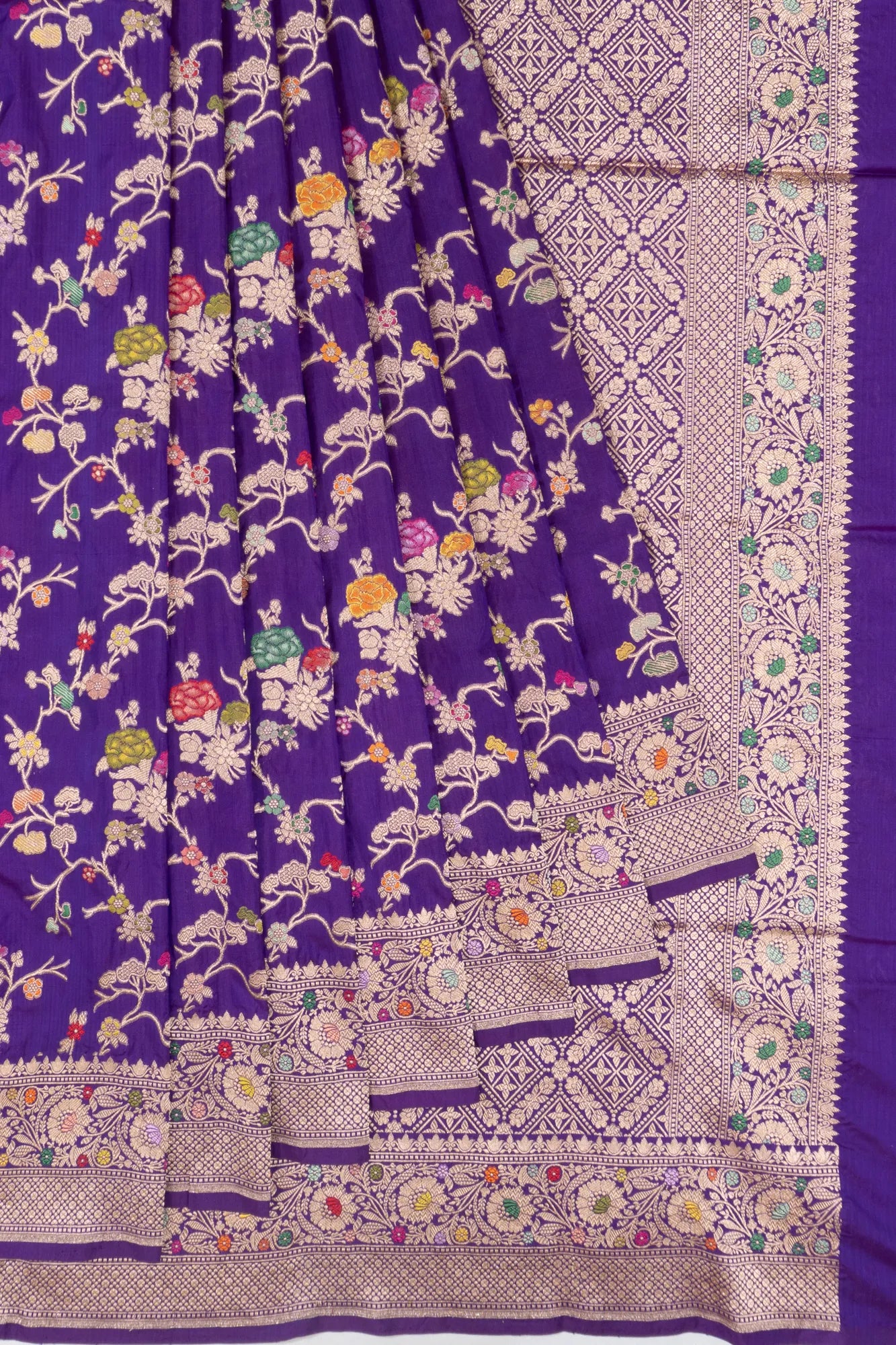 A resplendent violet base woven with gold zari floral phekwa jaal highlighted by multicolour meenakari work, adding vibrant depth and traditional finesse.