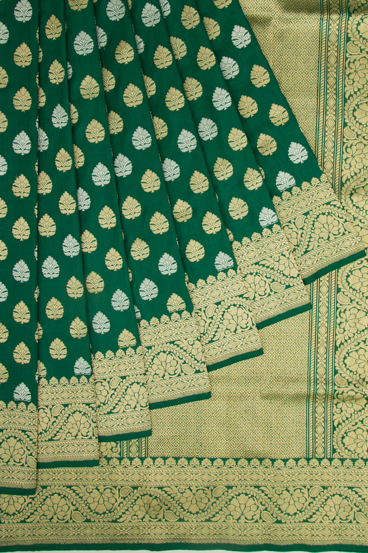 The stunning weave is beautifully surrounded by silver zari floral vines on a medium border Featuring a self-gold zari brocade pallu with floral vines and a self-plain blouse, it makes a beautiful symphony of colors