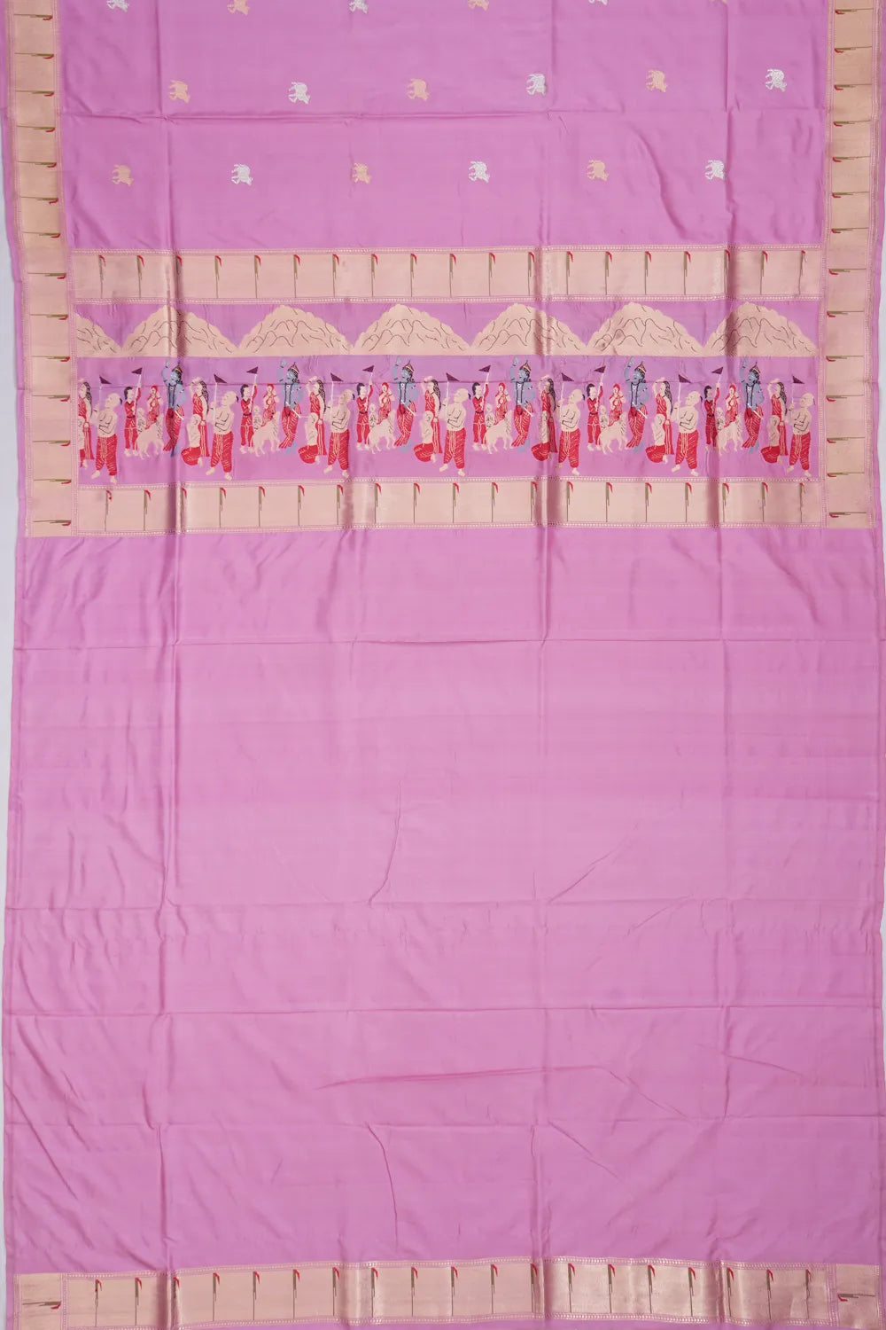 This saree is paired with a coordinated blouse in rich lavender, adorned with intricate zari detailing that enhances its timeless appeal