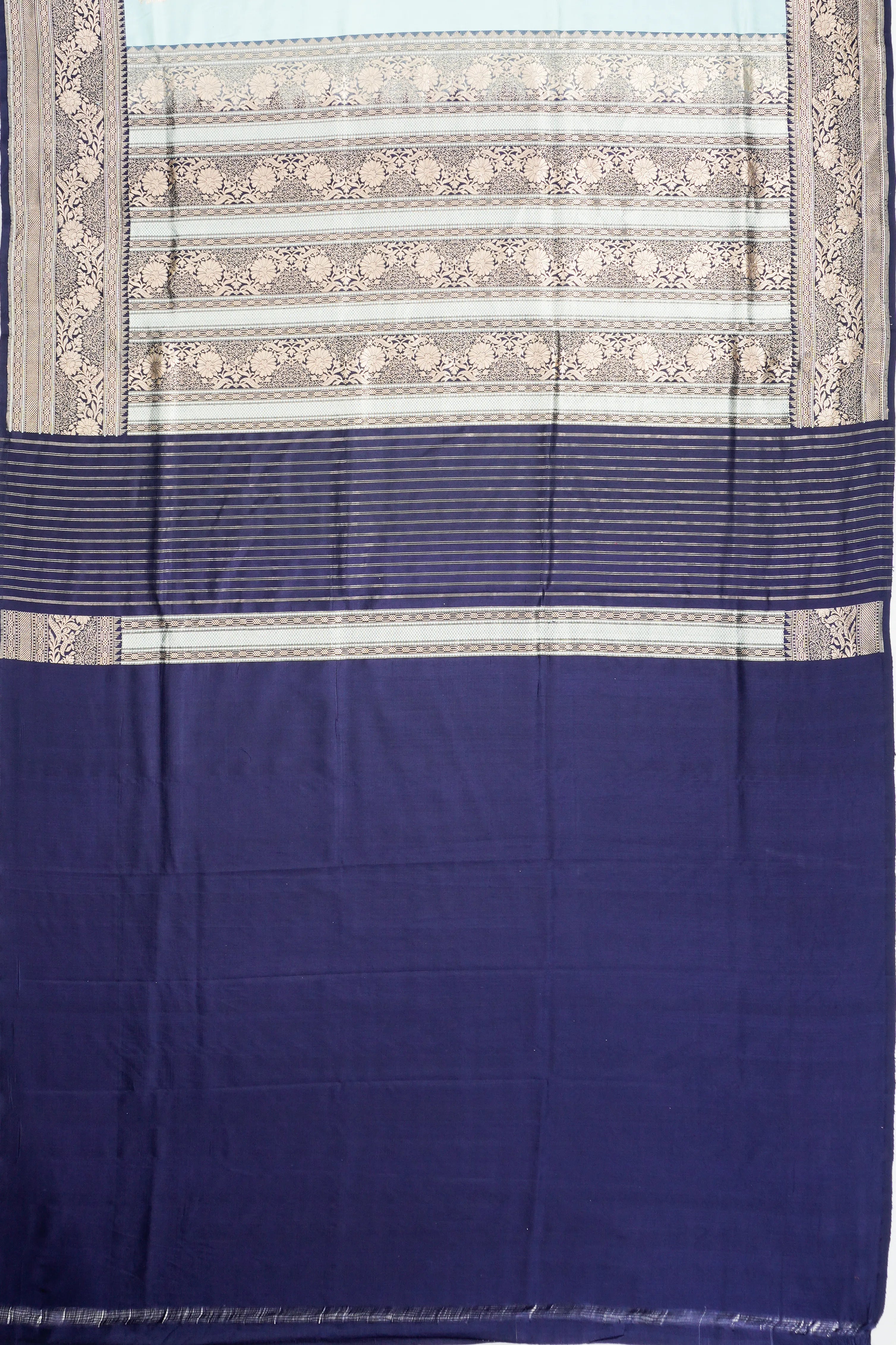 The saree is beautifully framed by a dark blue small border in contrast zari, adding a striking depth and definition