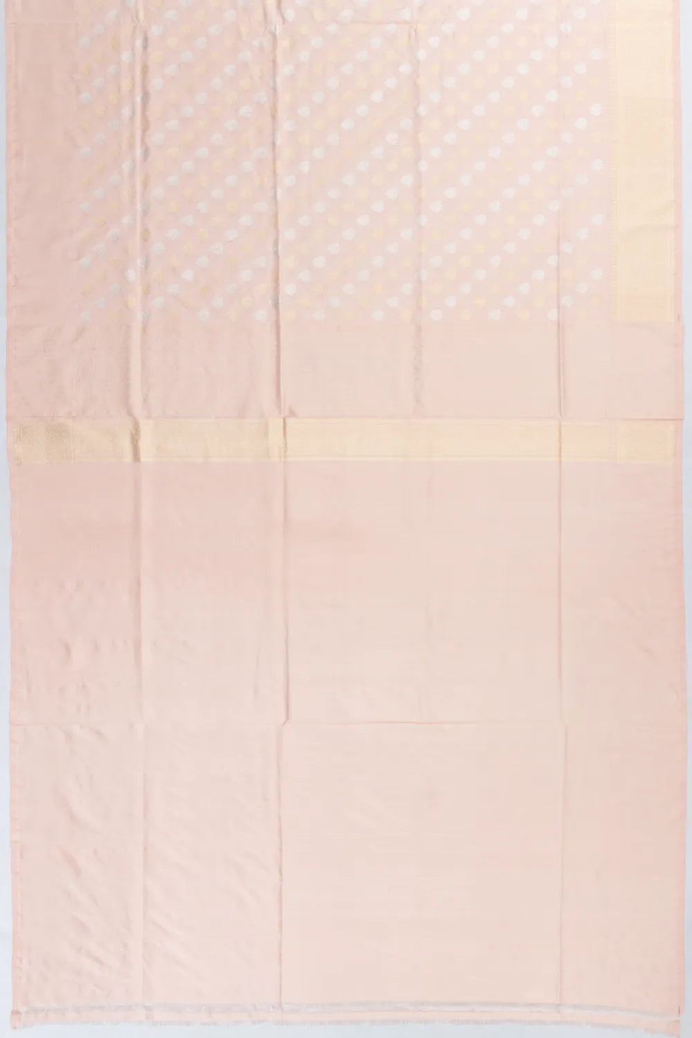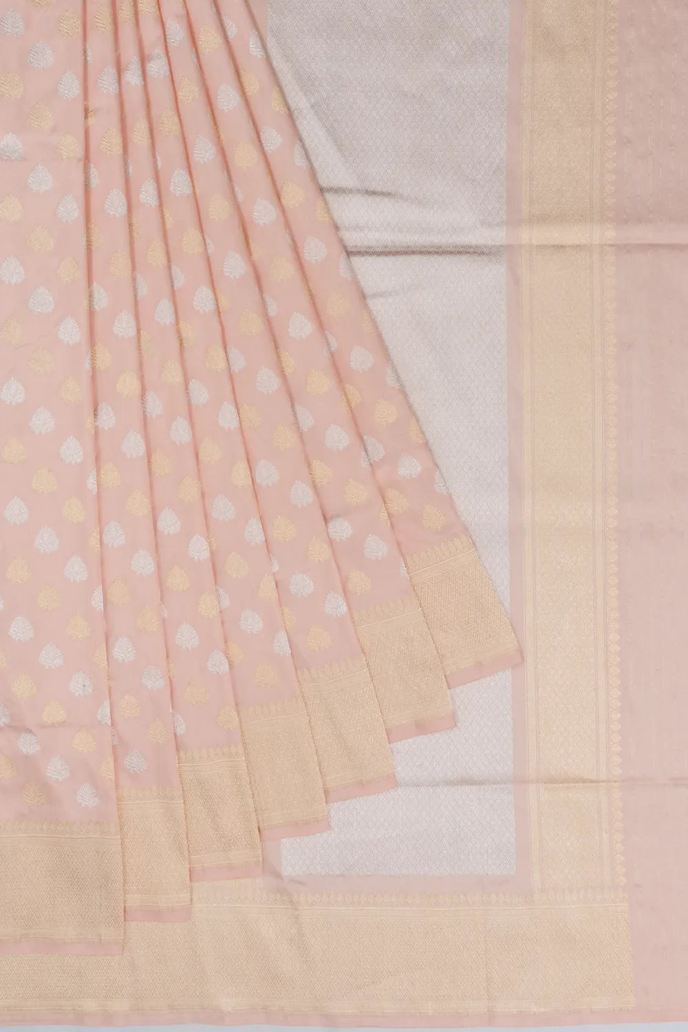 Body: Soft pastel orange silk adorned with elegant gold and silver zari floral kadwa buttas, lending a graceful and festive charm.