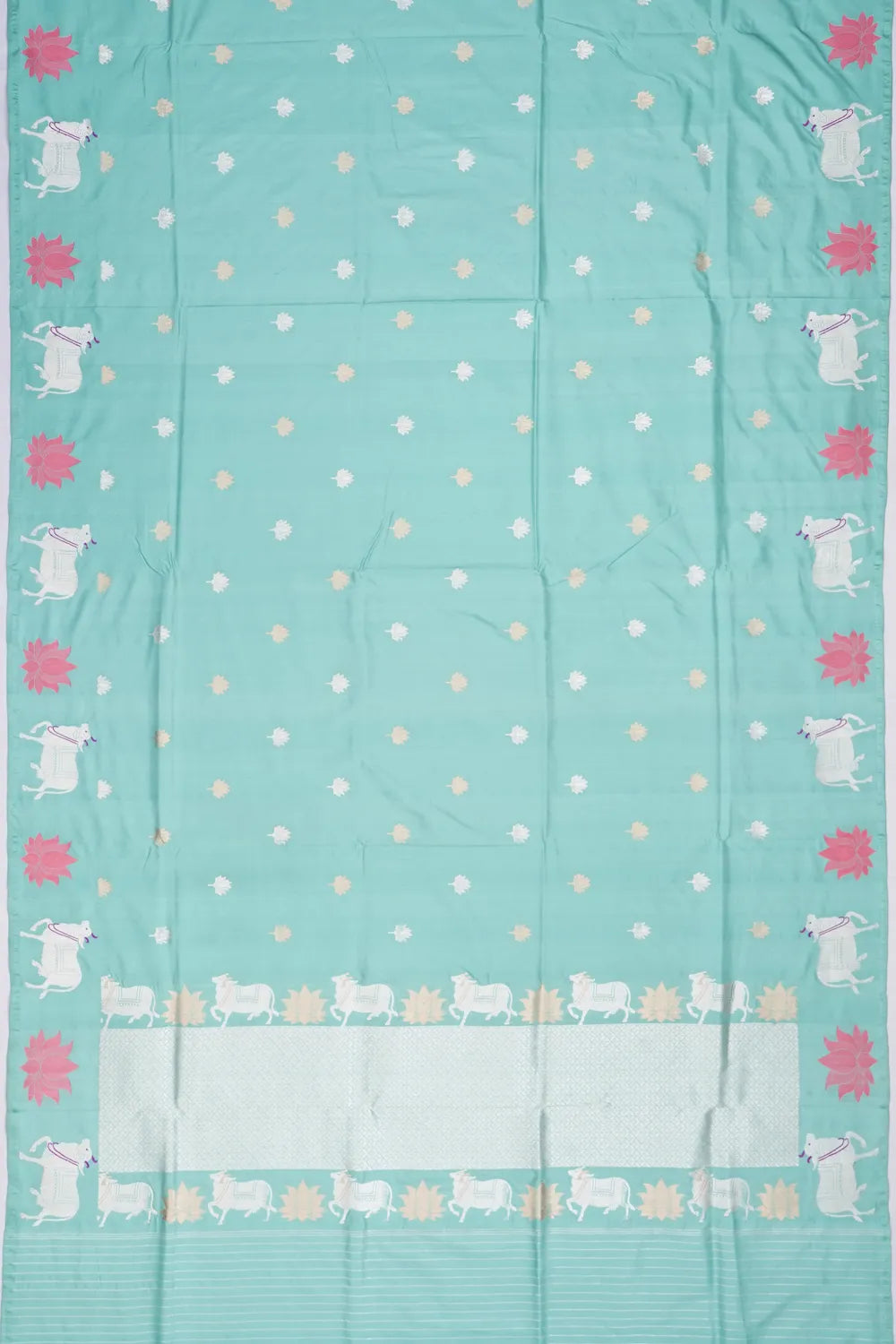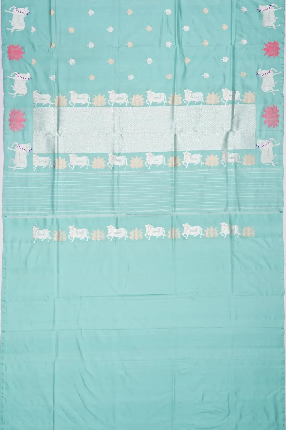 A stunning Pichwai border adds a heritage-rich touch, boasting motifs that reflect timeless artistry