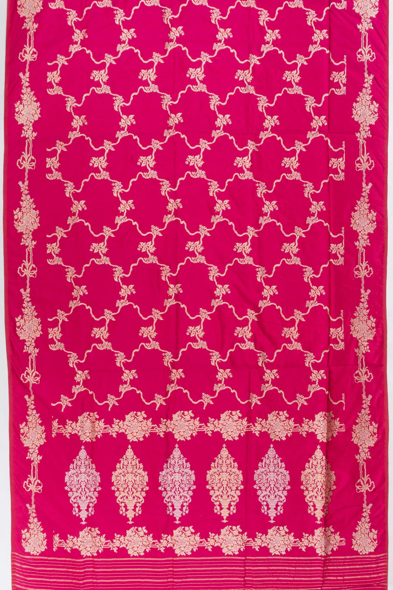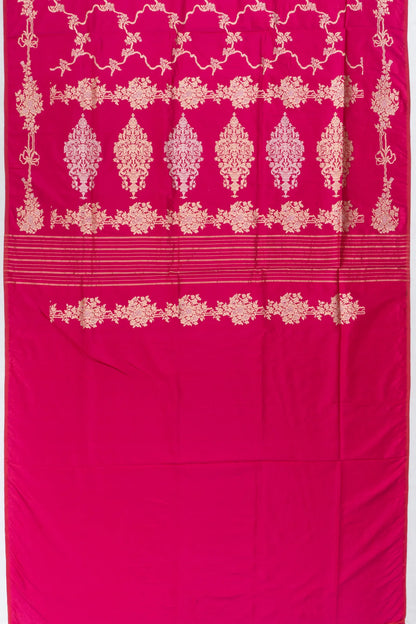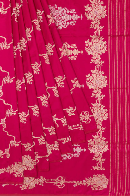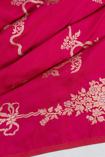 A radiant pink base intricately woven with gold and silver zari floral jaal, exuding timeless elegance with a soft metallic sheen.