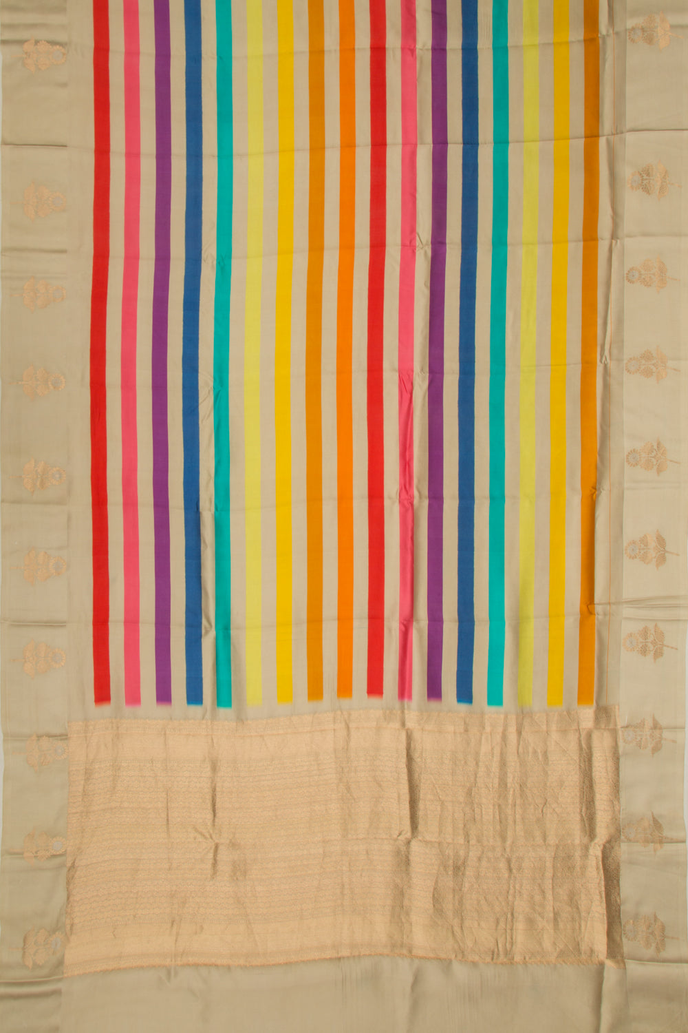 This elegant saree features printed horizontal lines on the body, adding a touch of sophistication The self satin medium border is adorned with gold zari floral motifs, enhancing its beauty