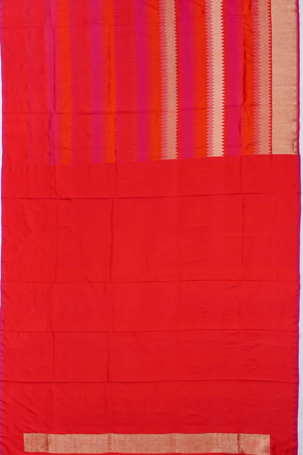 The rich red silk is adorned with intricate zari lines, creating a tapestry of refined beauty and timeless grace