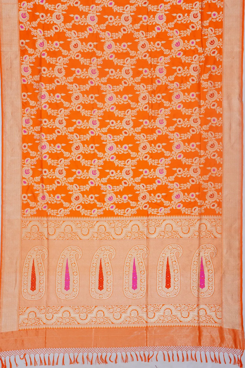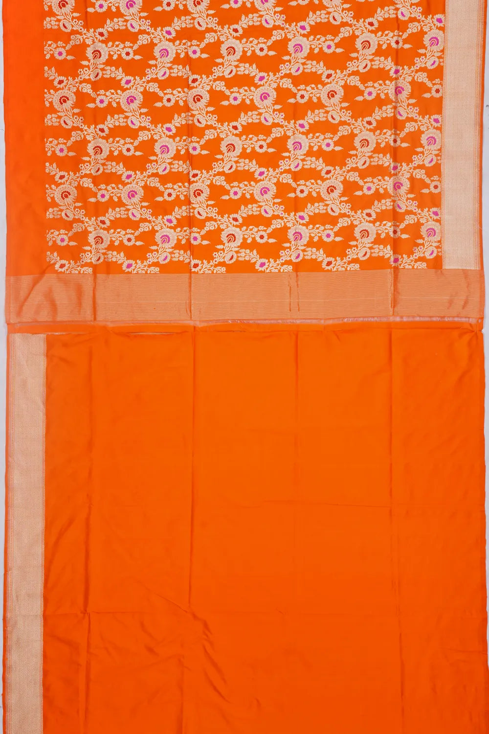 Wrap yourself in the luxurious allure of the Banarasi Silk Meenakari Jaal Orange Saree, a stunning tribute to heritage artistry The saree body showcases an exquisite gold zari floral jaal, interwoven with vibrant meenakari accents, creating a tapestry of color and elegance
