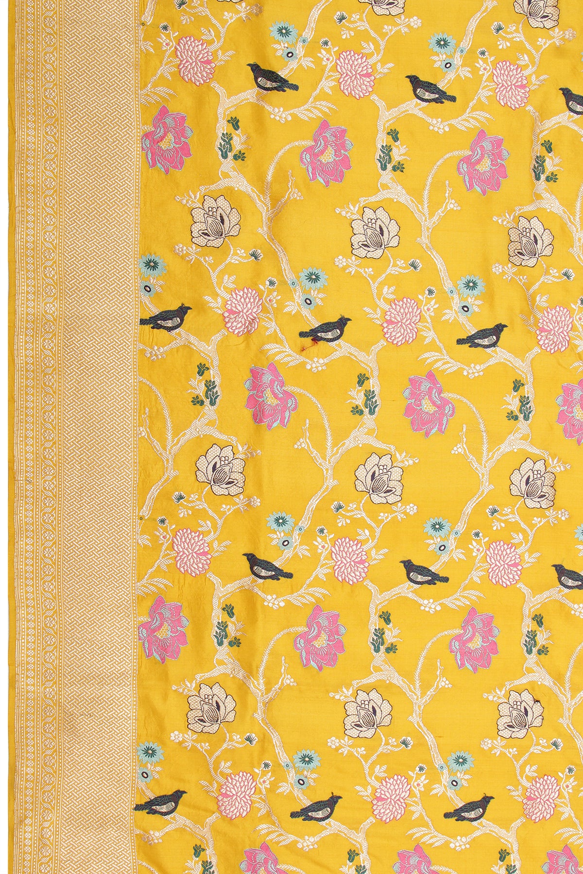 Body: This vibrant yellow saree features a gold zari floral jaal intricately designed with bird motifs and adorned with multicolour meenakari, bringing a lively touch to traditional attire.