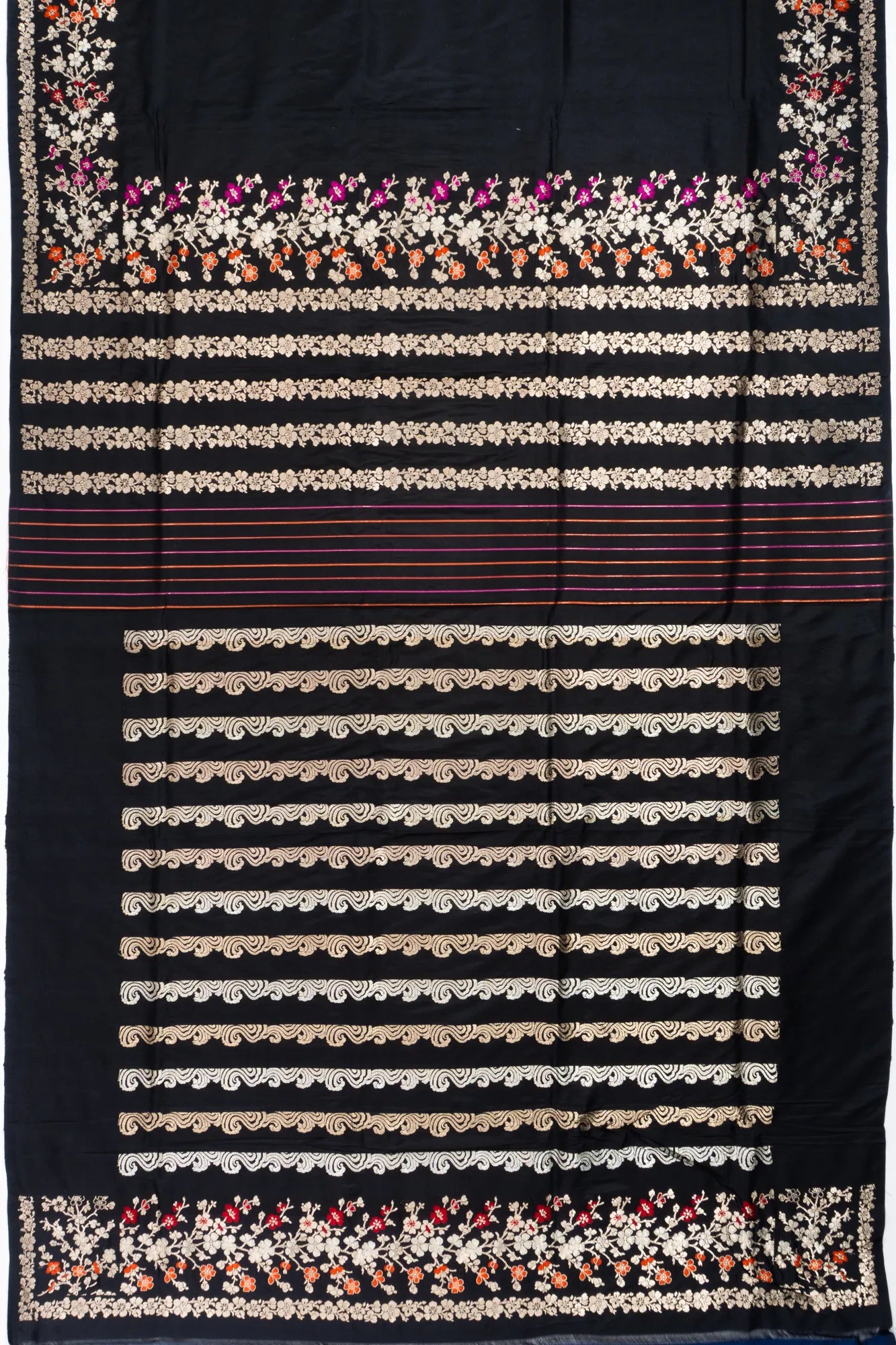 The self medium border is richly adorned with gold zari floral brocade highlighted with meenakari work, adding a hint of vibrant artistry.