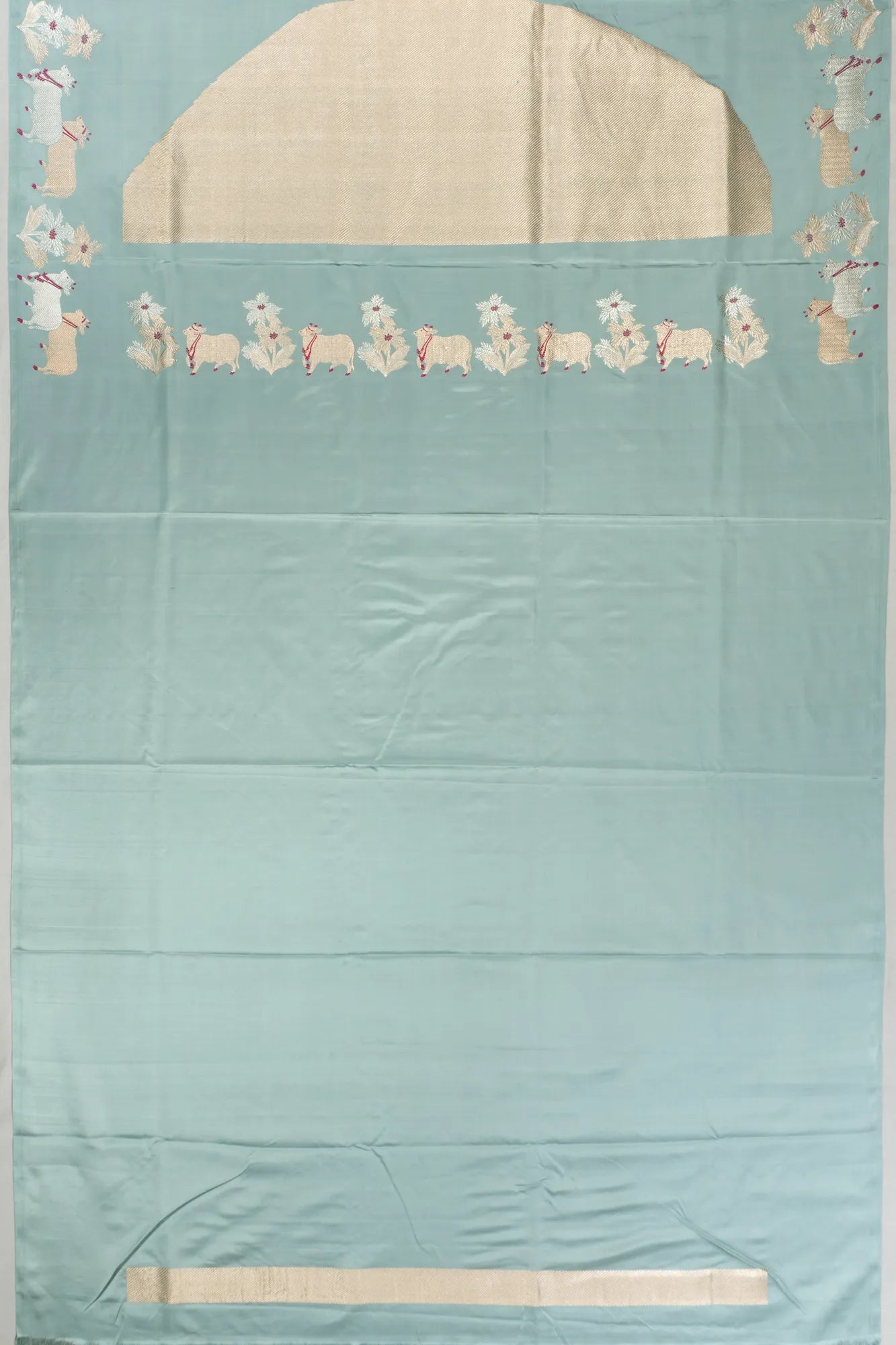 The sarees body, in serene pastel blue, offers a subtle canvas that beautifully highlights the exquisite pichwai motifs along the self gold and silver zari border