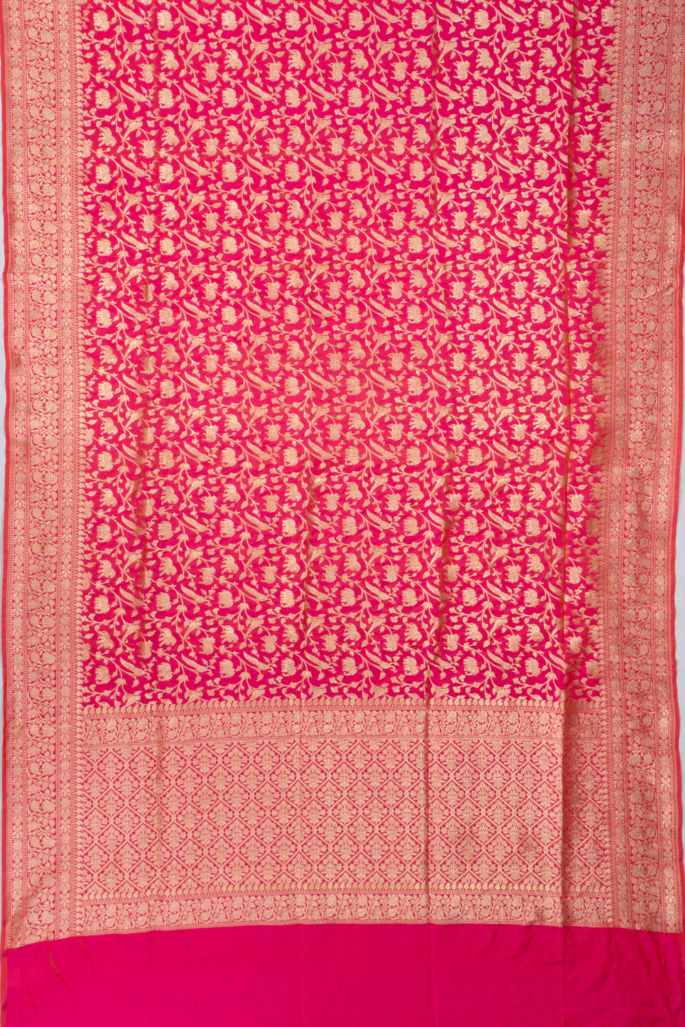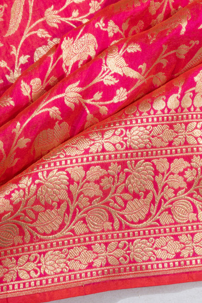 Featuring exquisite gold zari work with detailed floral vines interspersed with elegant animal motifs, creating a rich dual-tone pink and orange effect.