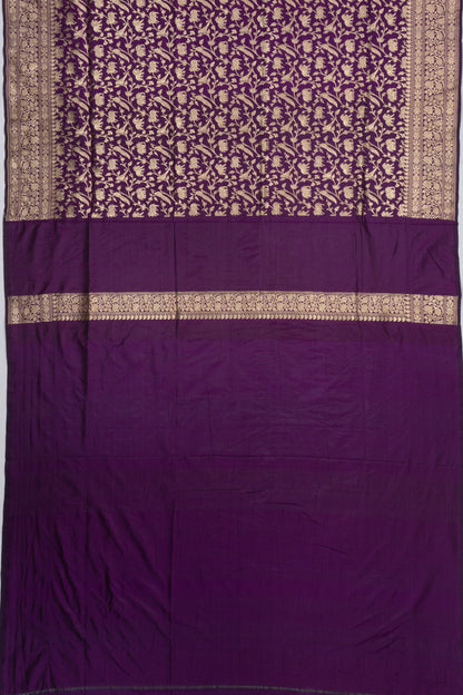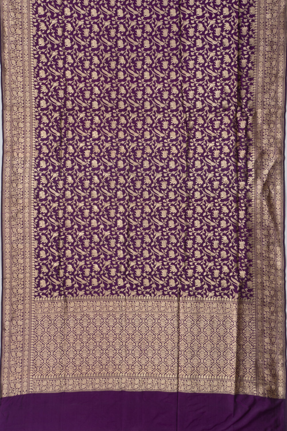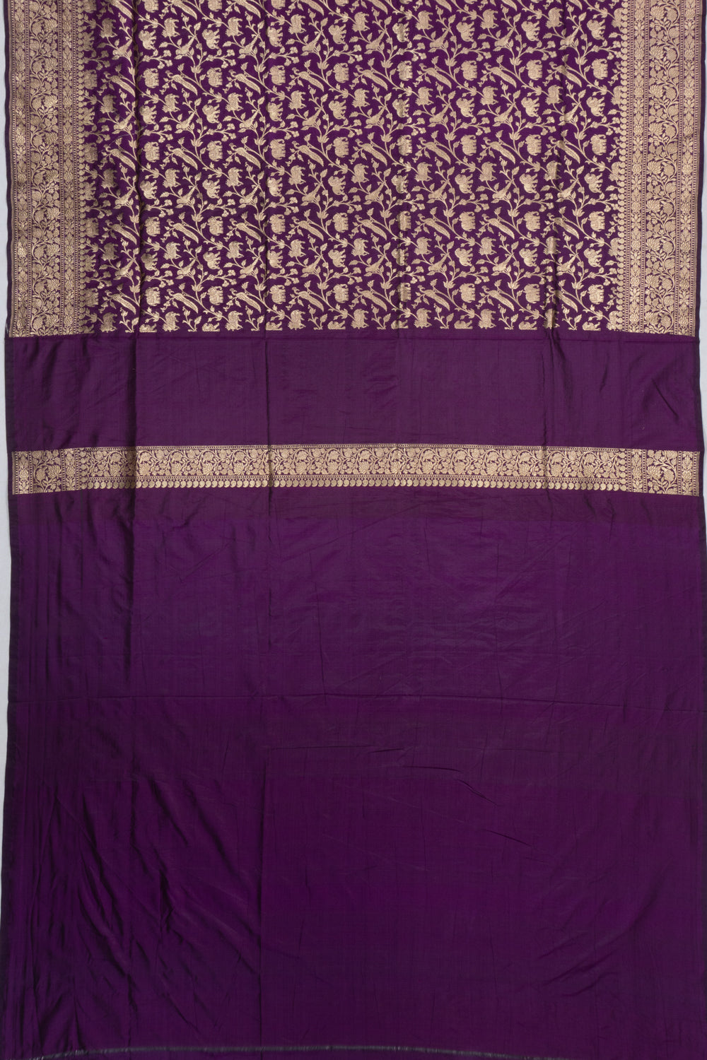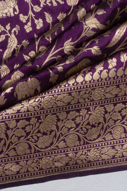 The body features a luxurious purple base adorned with intricate gold zari floral jaal and woven animal motifs, inspired by traditional Shikargah artistry.