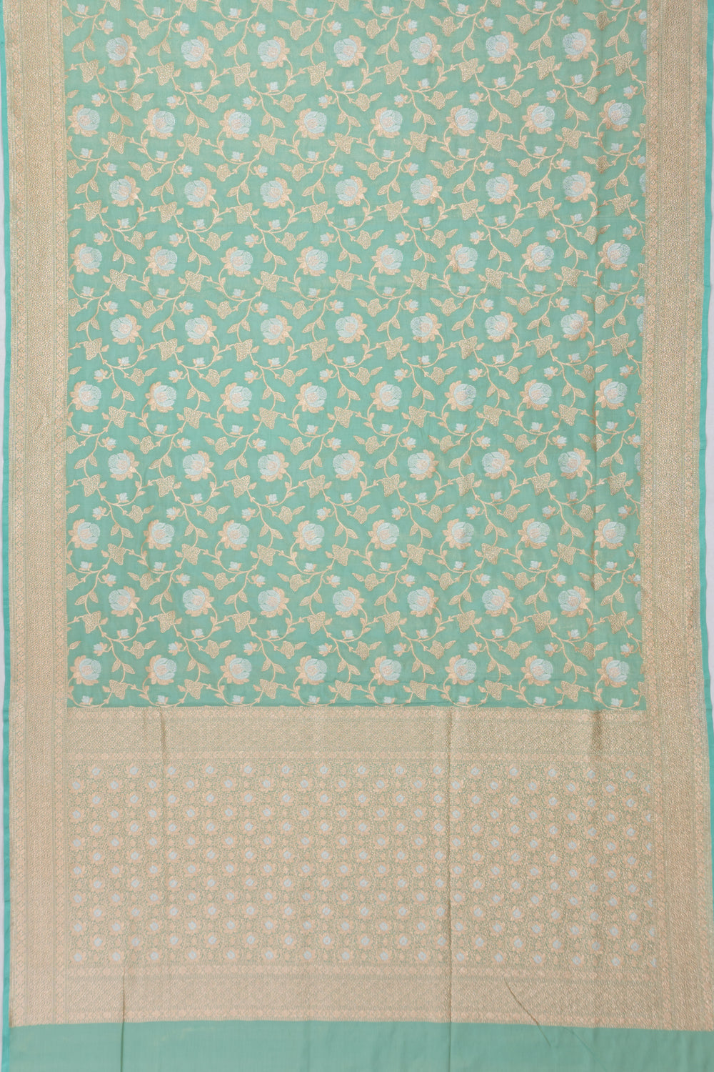 Body: Sea green Banarasi Silk tissue with intricate gold and silver zari floral brocade work, creating a delicate shimmering floral pattern.