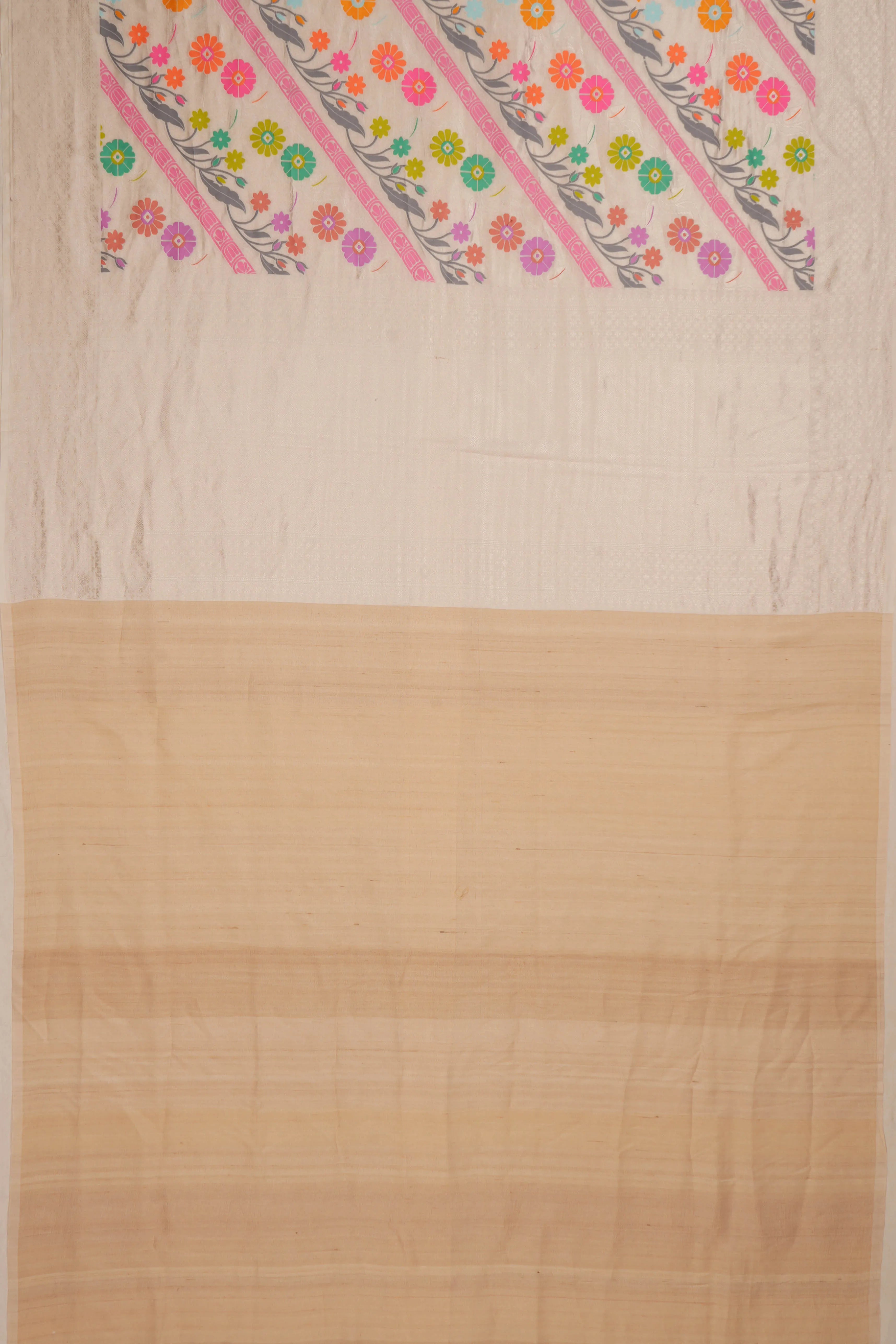 Silver zari tissue beautifully woven with intricate floral brocade, adding a shimmering elegance to the saree.