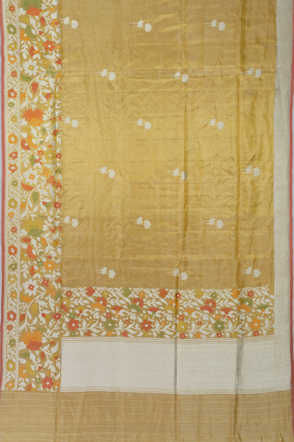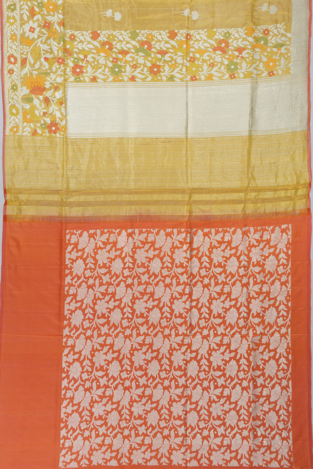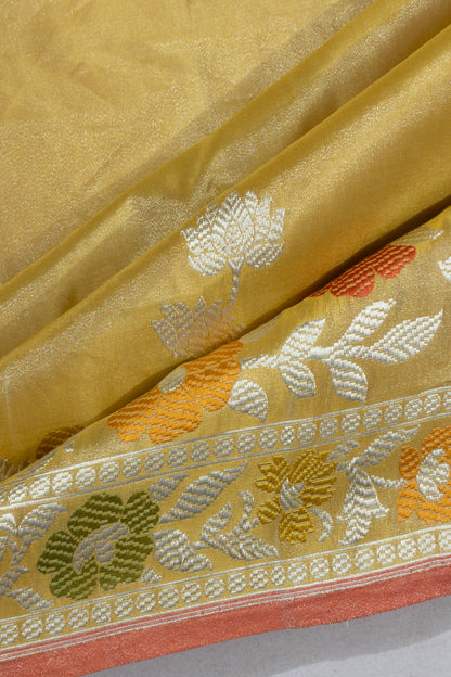 Yellow tissue Silk with delicate silver zari floral butta motifs, giving a subtle shimmer.