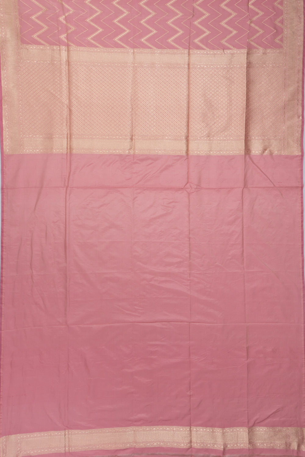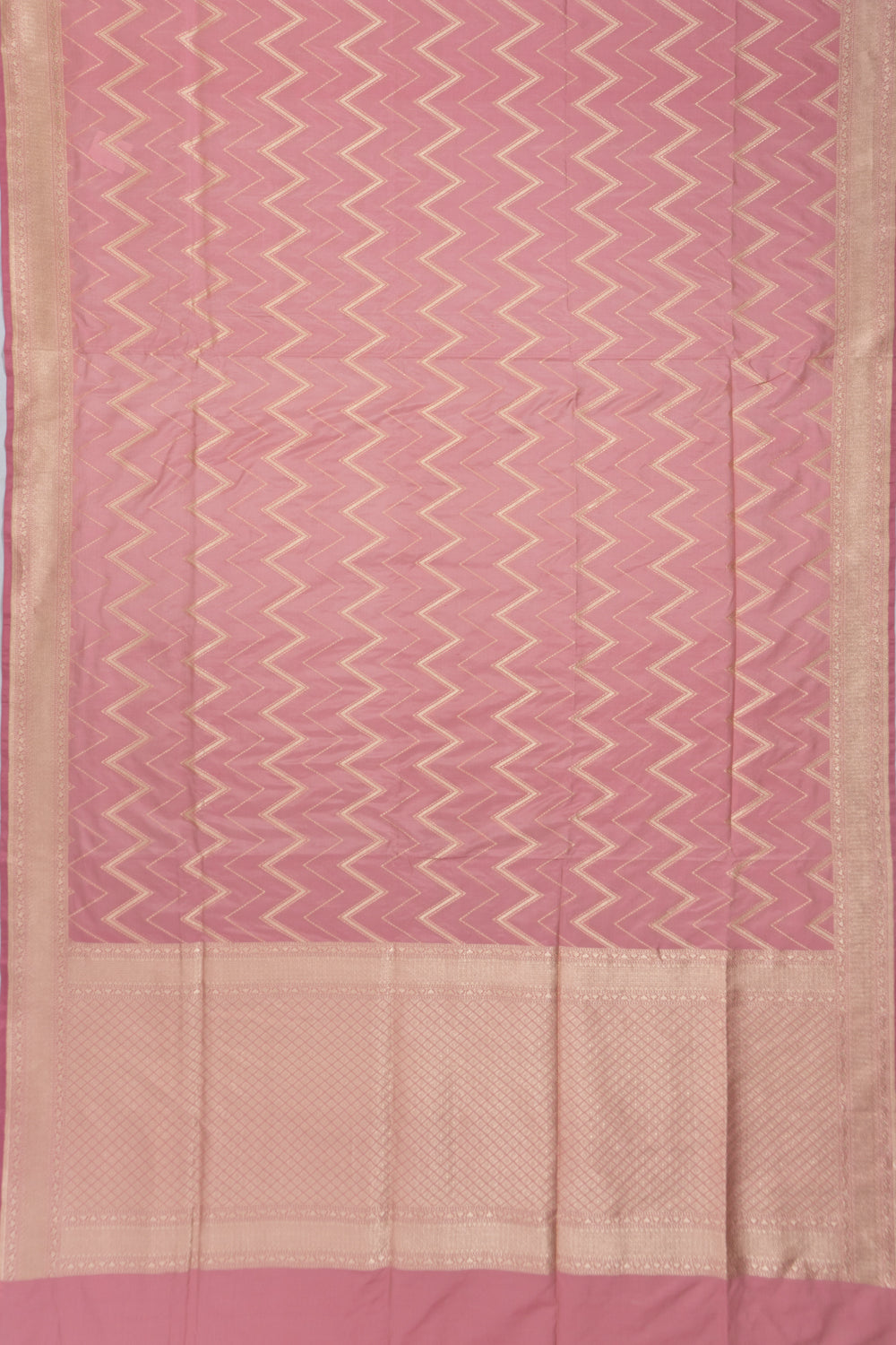 The pink Silk showcases distinctive gold zari zig zag lines, offering a modern twist on traditional motifs.