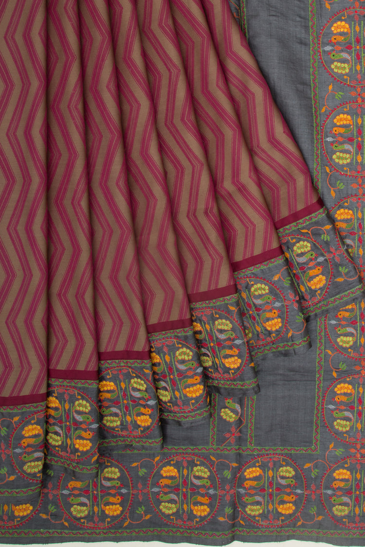 The glorious weaves are beautifully enclosed into contrast animal motifs embroidery grey medium border The saree is further enhanced with contrast animal motifs embroidery pallu, adding to the already striking look To complete the ensemble, a beautiful contrast grey plain blouse is included, creating a symphony of colors and textures that is sure to turn heads
