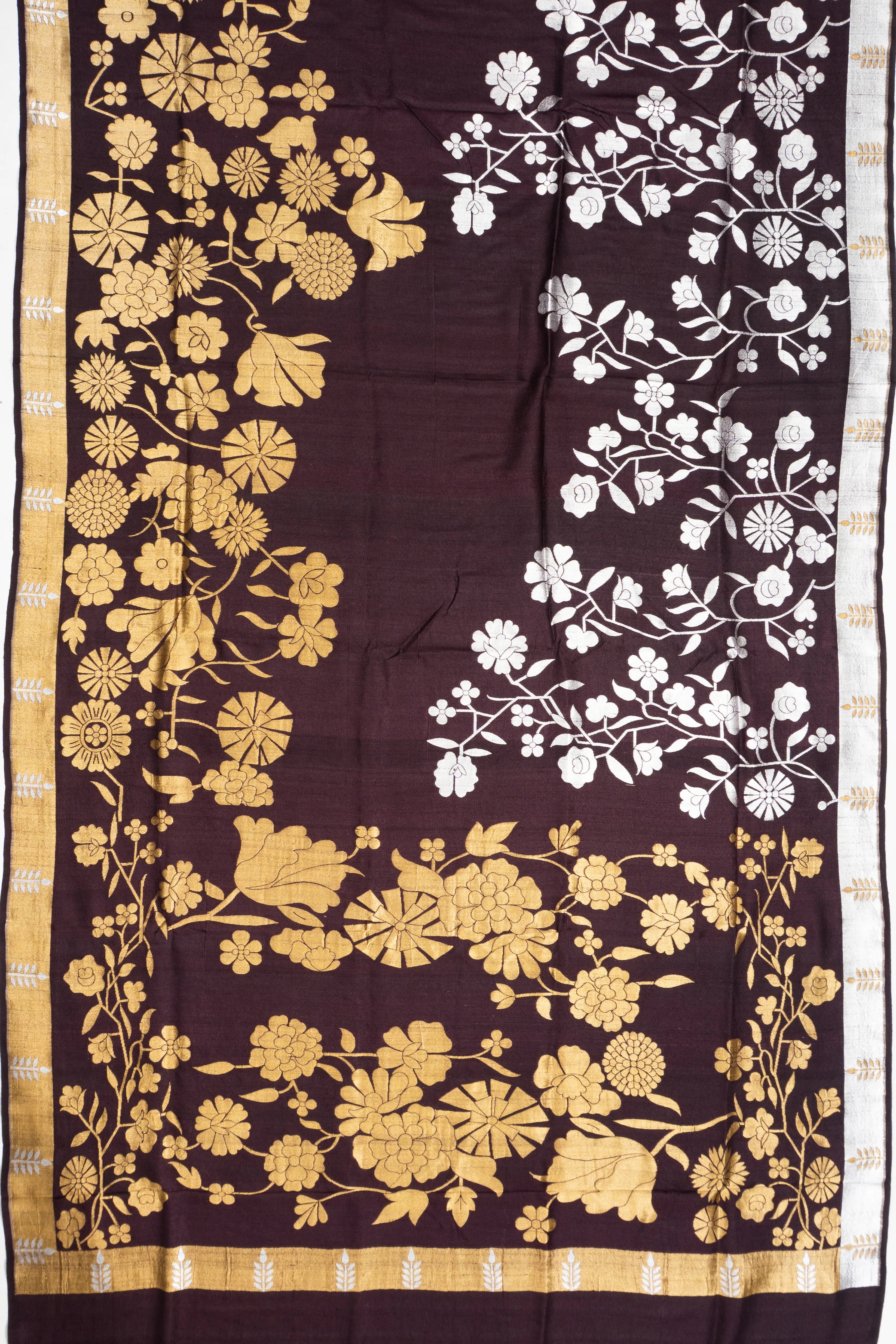 The body is adorned with gold and silver zari floral brocade, imparting a rich texture and a touch of opulence that only the finest zari can offer