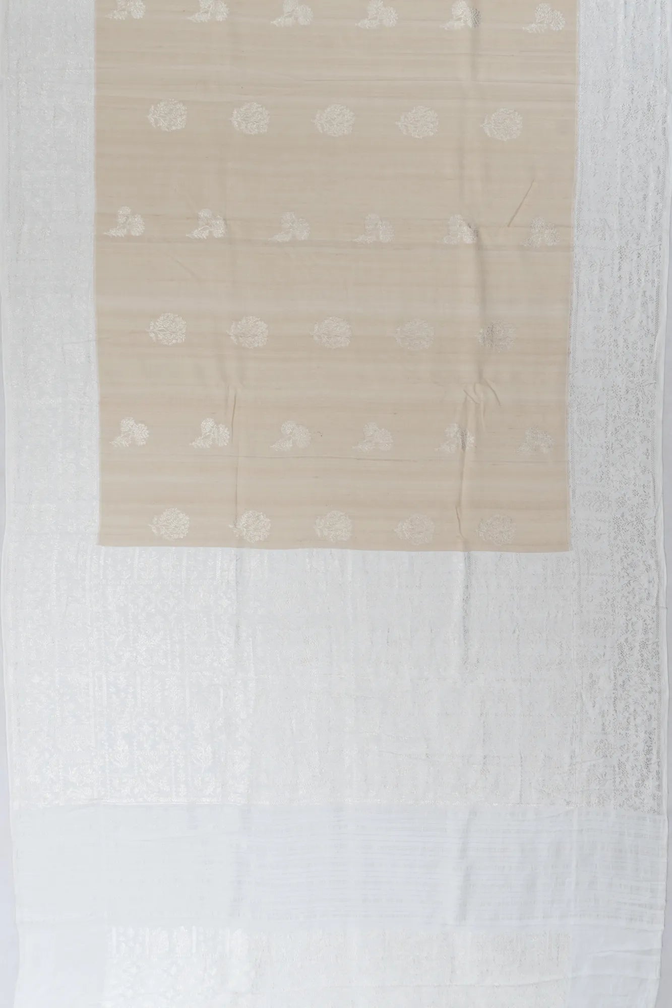 The body is adorned with delicate silver zari floral buttas, subtly shimmering against the beige Tussar base for a graceful and classic look.