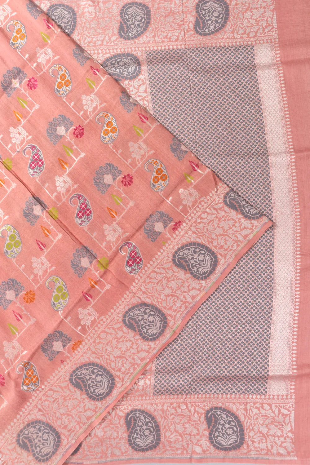 Woven in silver zari, the body showcases an exquisite floral brocade with paisley motifs, lending a classic and timeless appeal to the peach fabric.