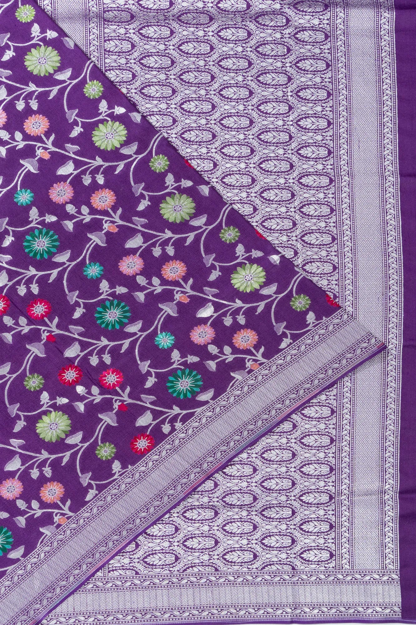 The body is adorned with a graceful silver zari floral jaal, enriched with multicolored meenakari that adds a vibrant touch to its elegant design