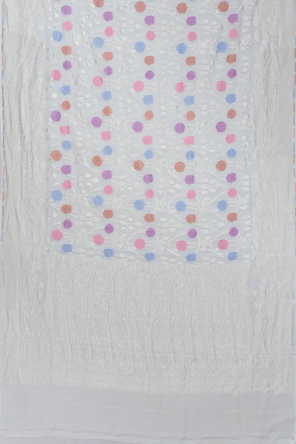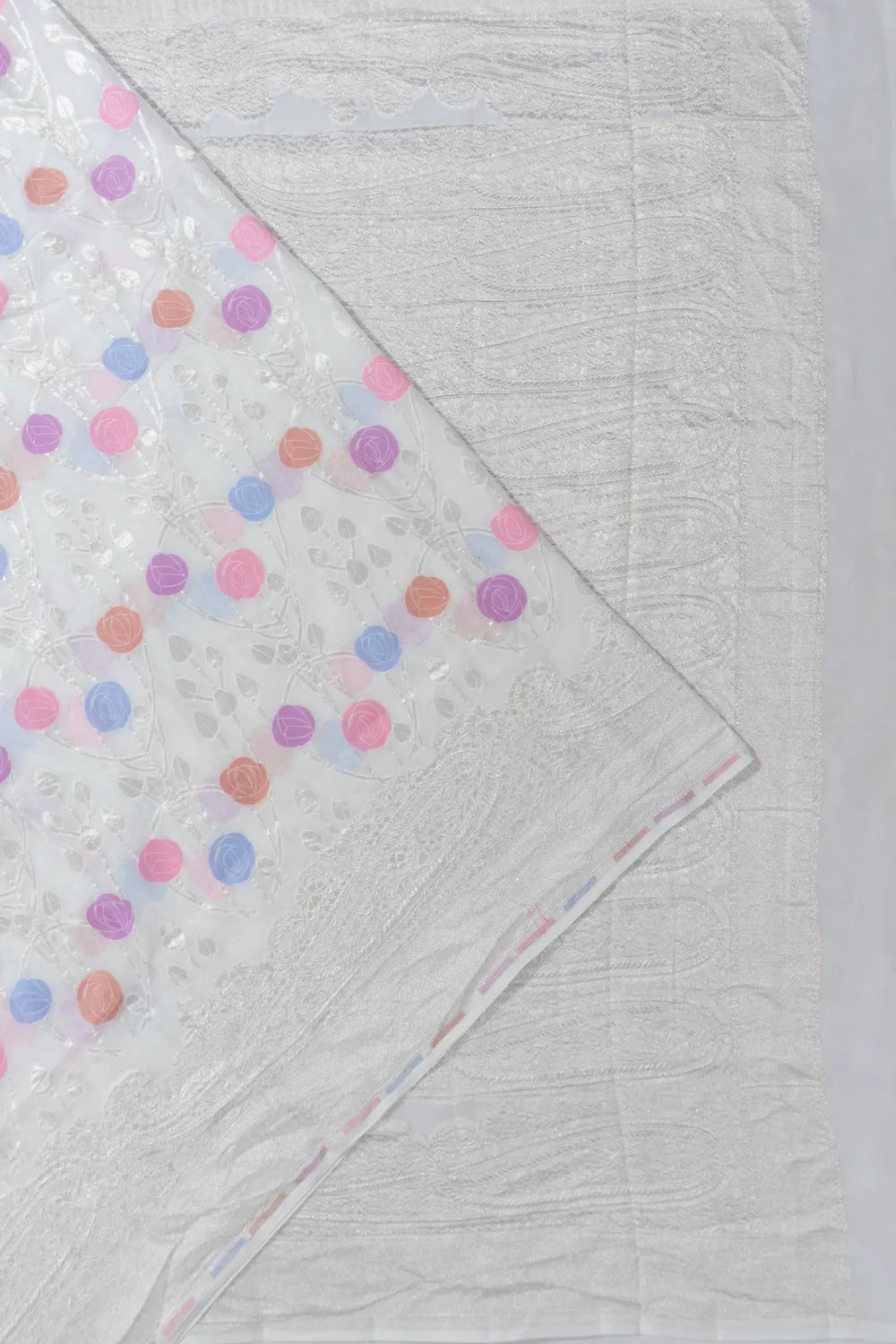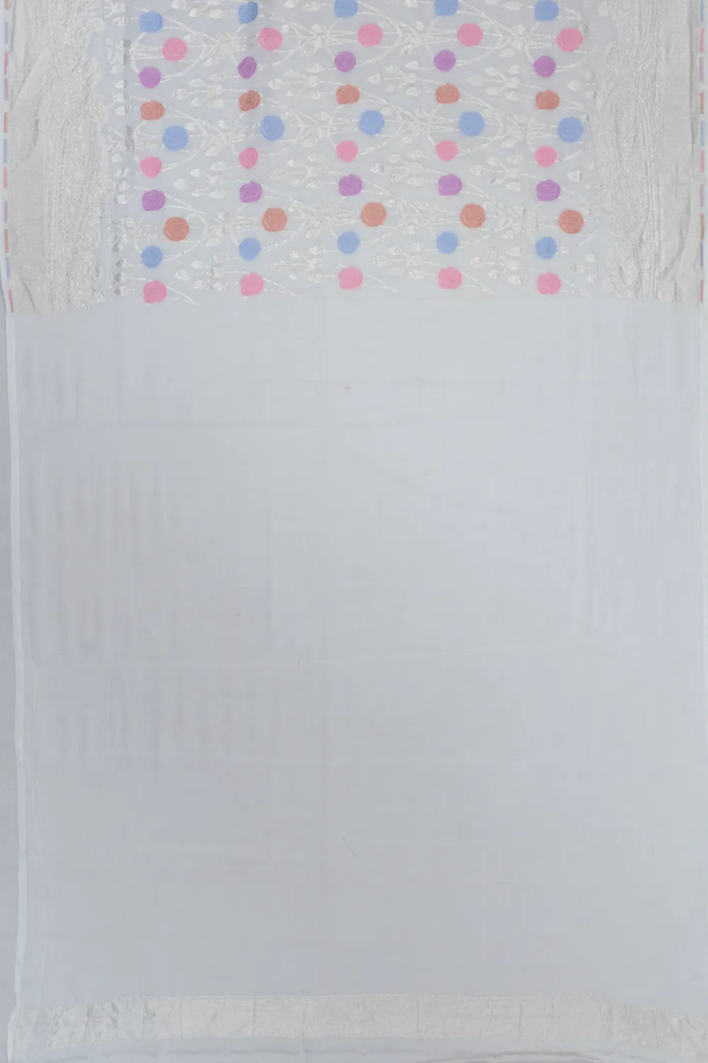 Crafted with silver zari, the body displays a fine floral jaal design with multicolor highlights, adding a soft yet vibrant touch to the white base.