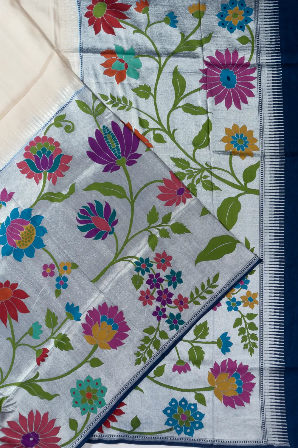 The contrast silver zari tissue border is large and ornate, featuring multicolor floral highlights that add vibrancy and richness.