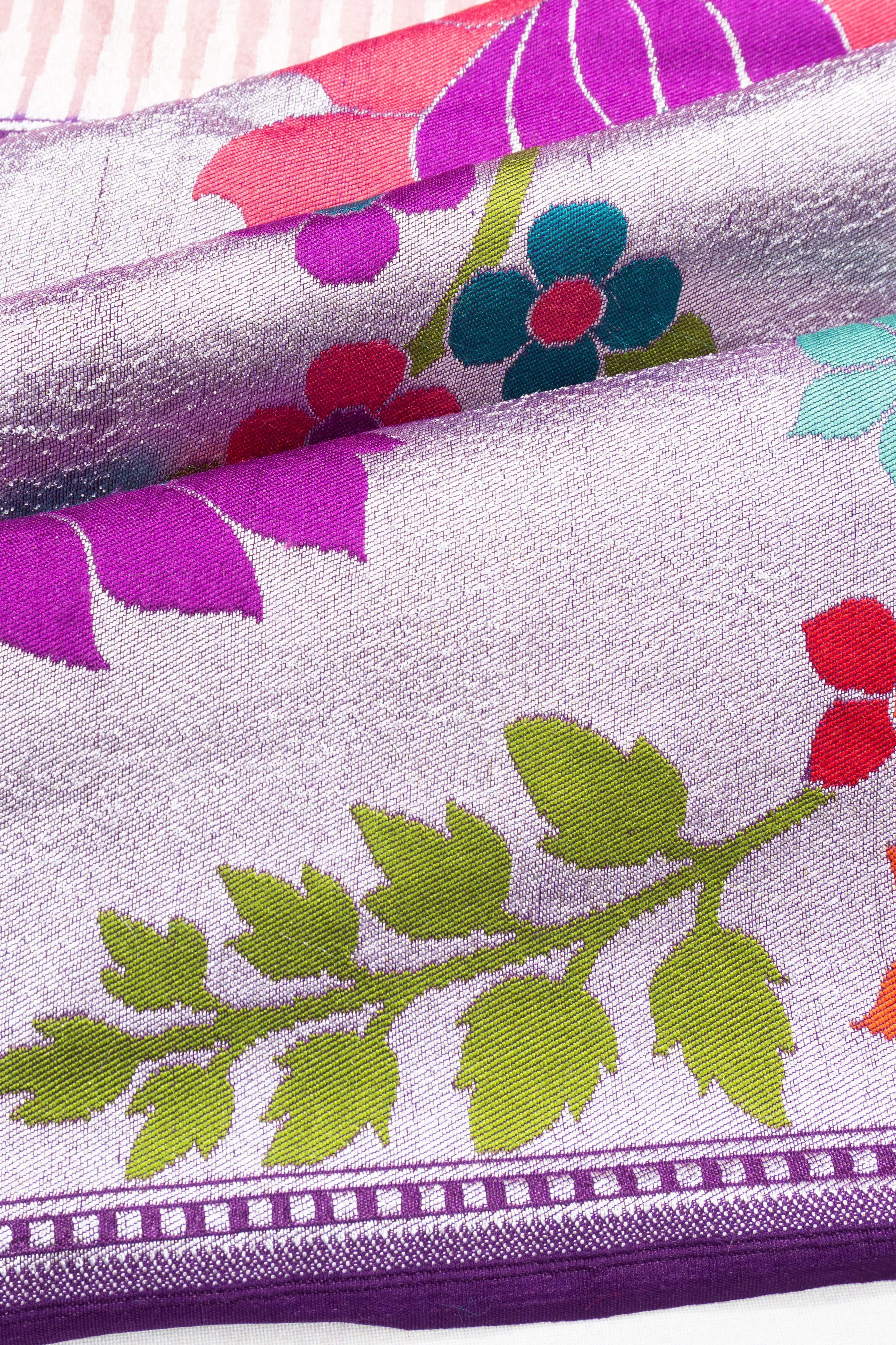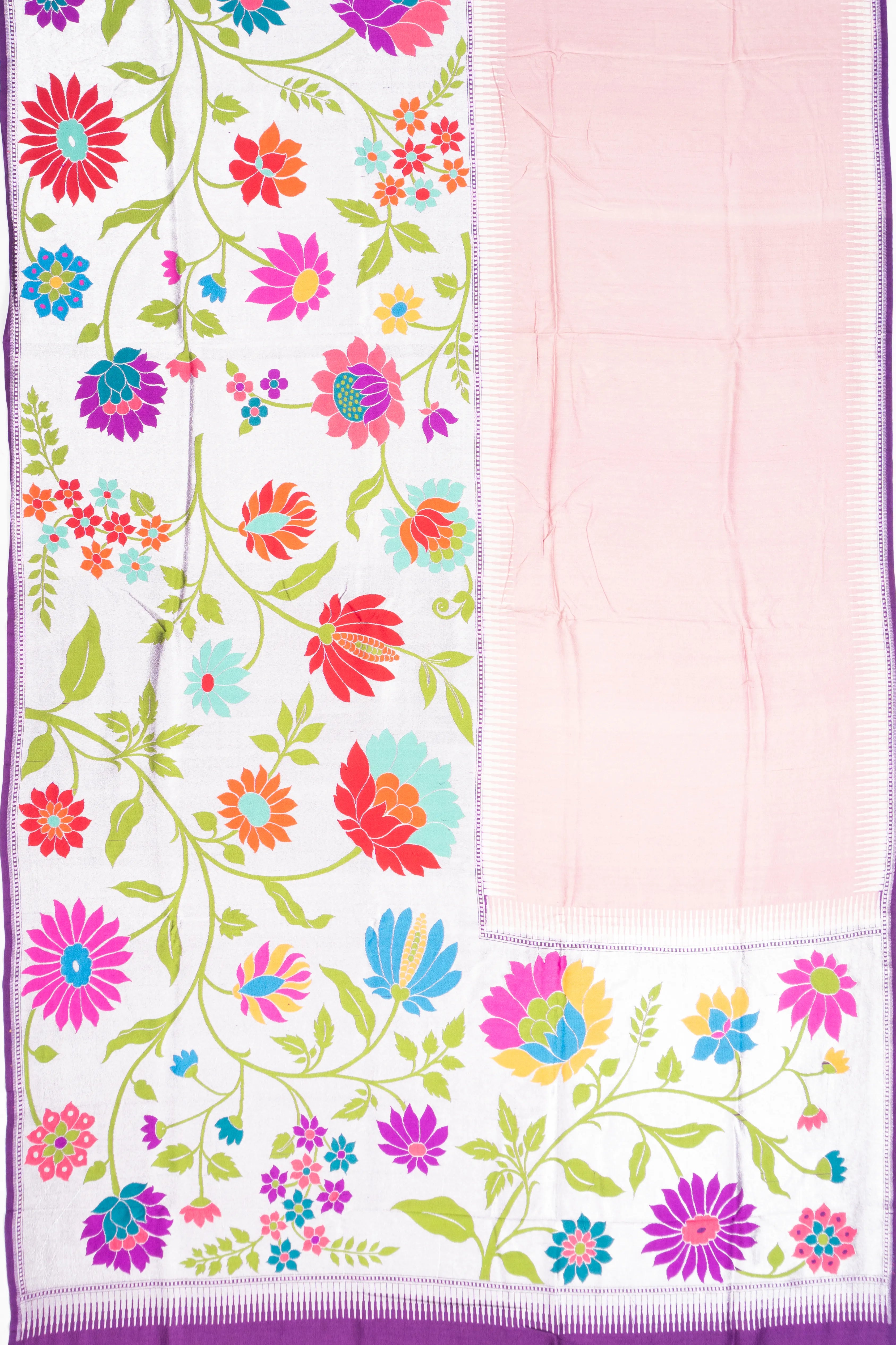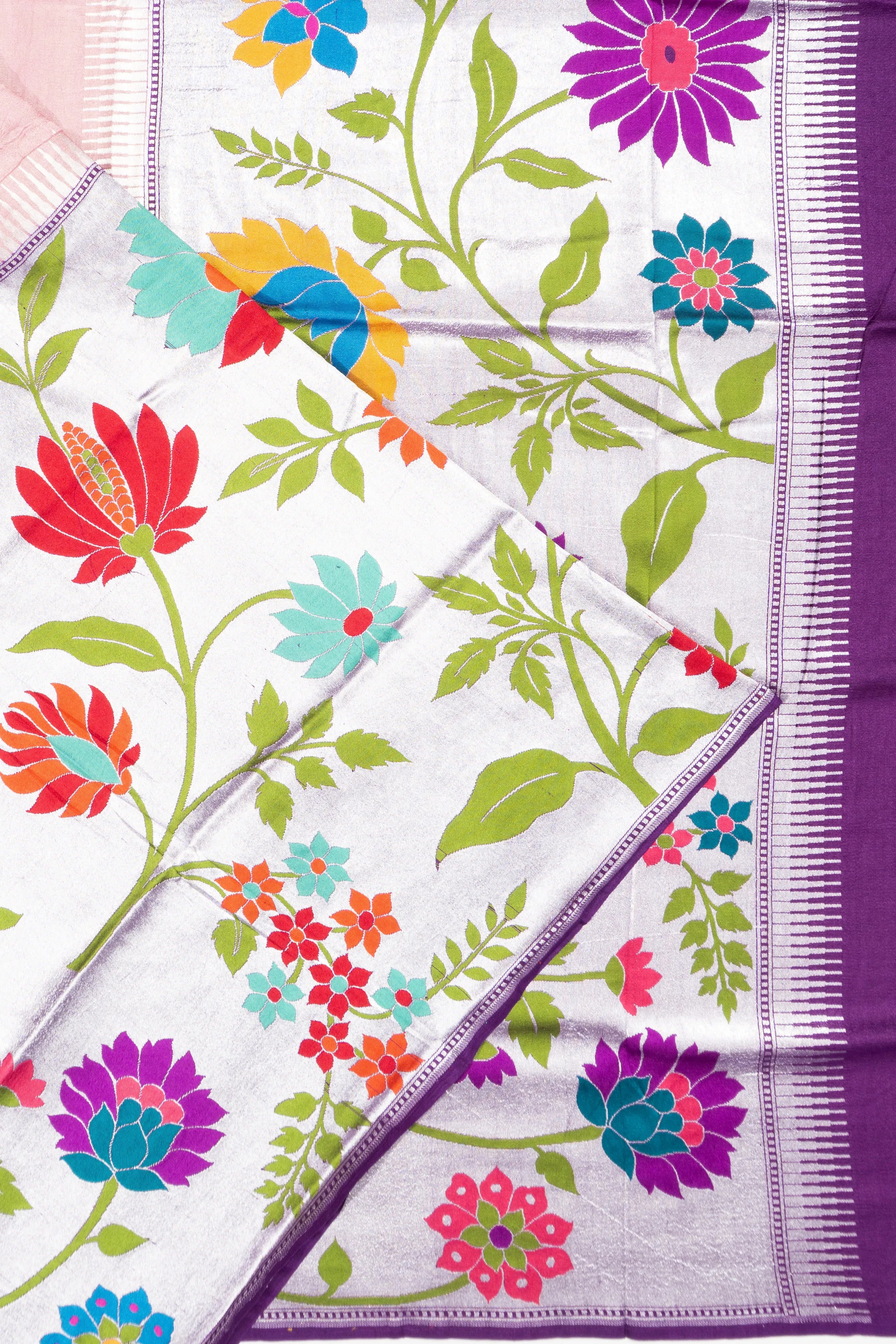 Paired with a self-plain purple blouse, this saree presents a seamless blend of colors and motifs, perfect for those seeking a piece that speaks of timeless beauty and cultural richness