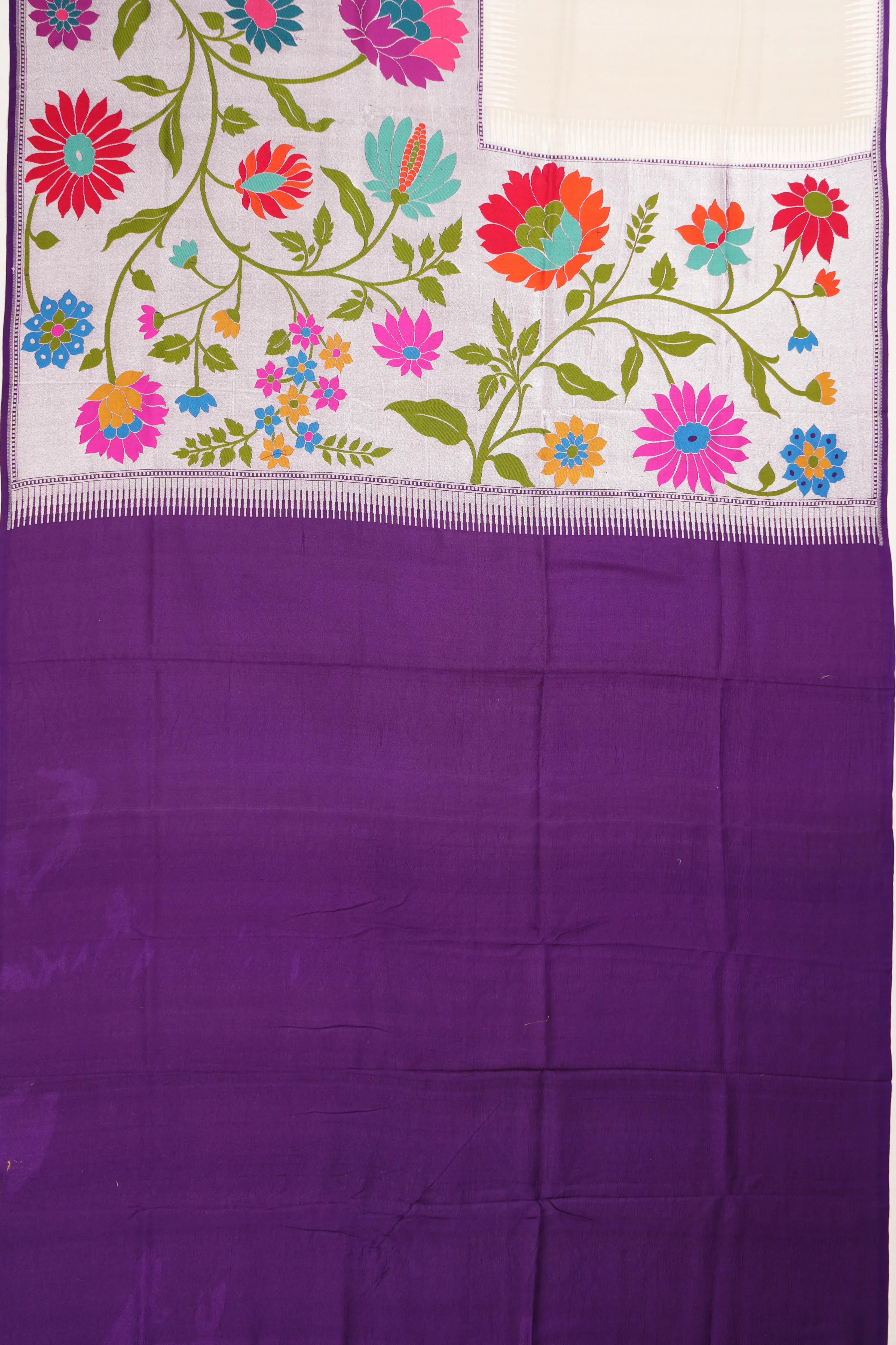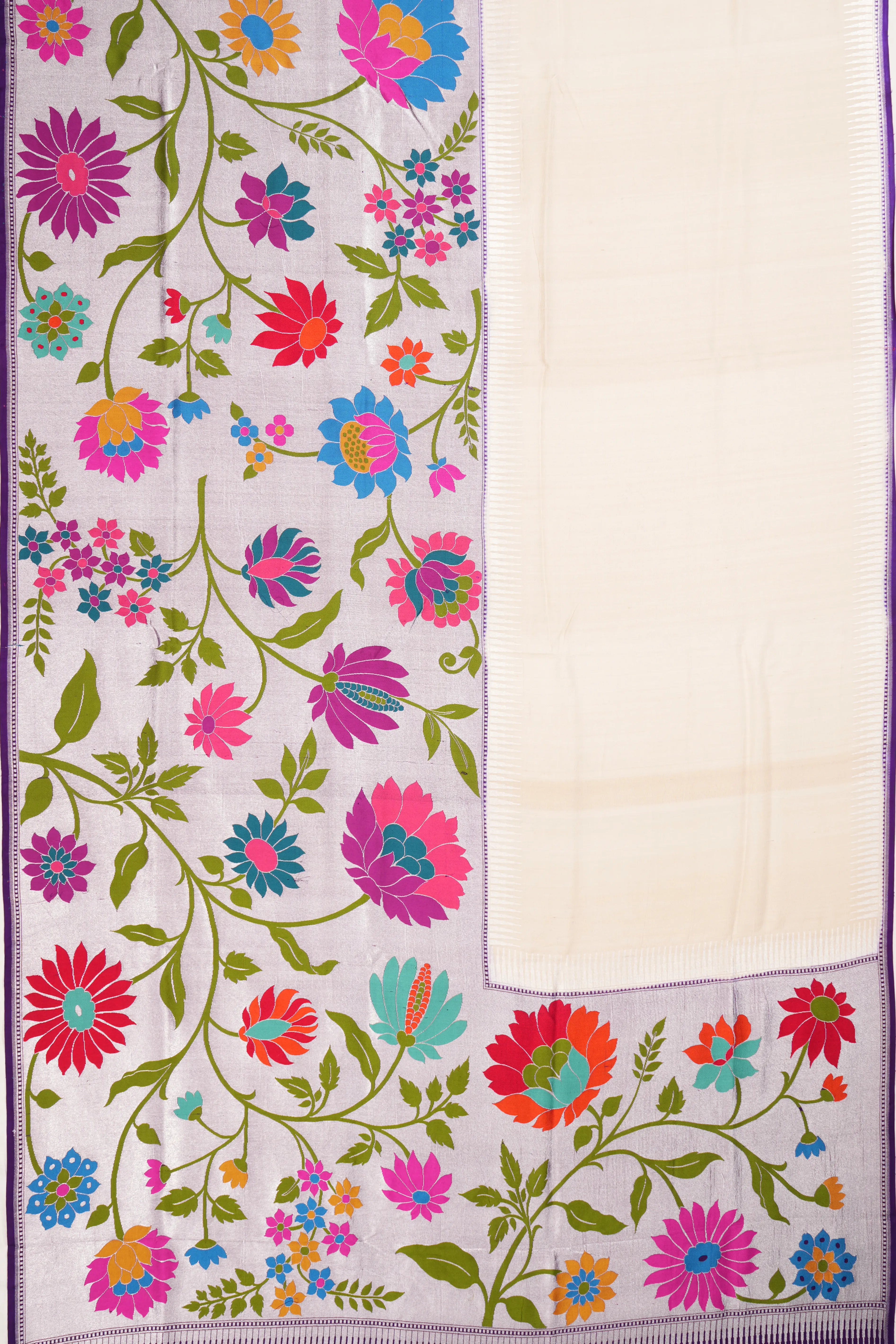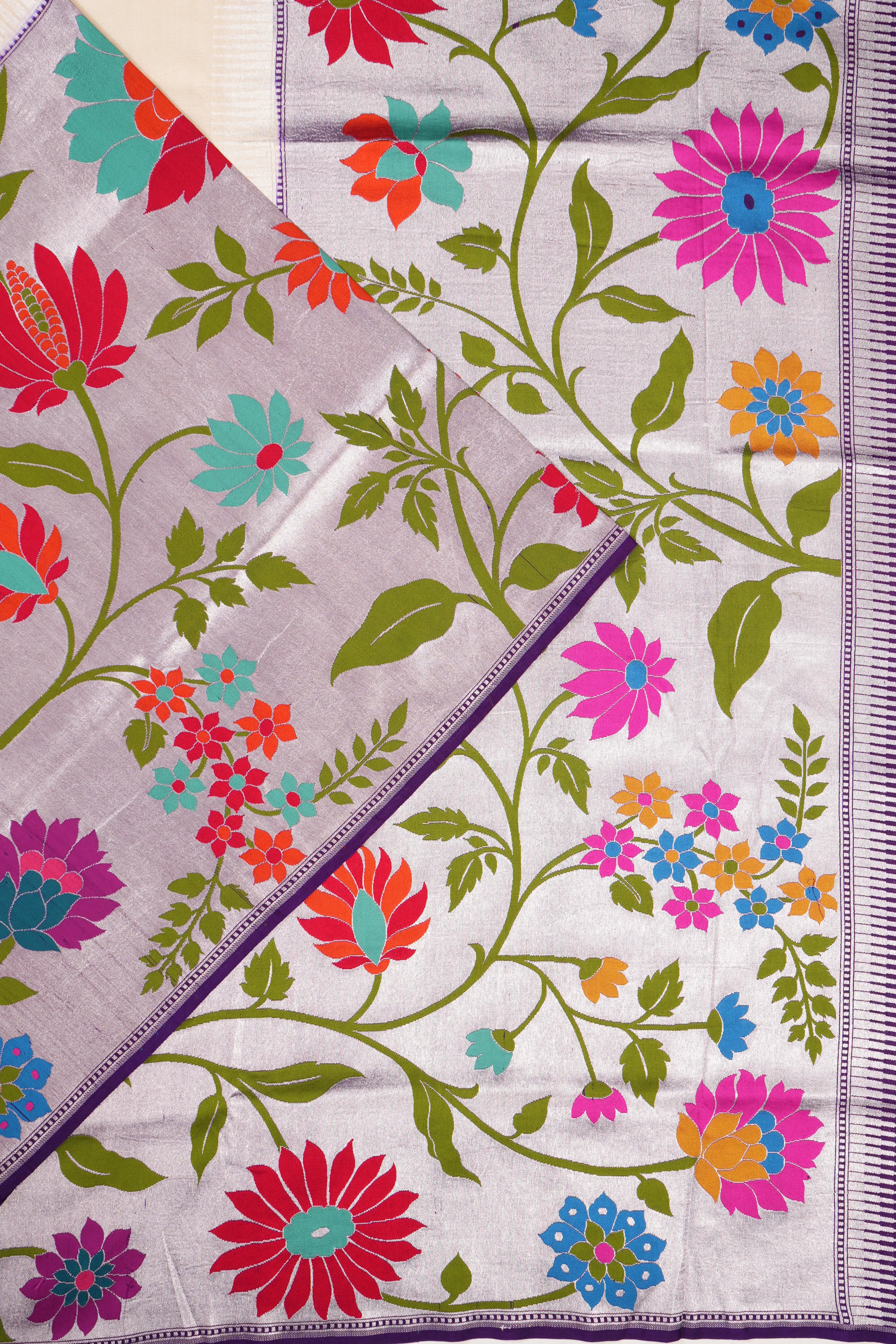 A striking contrast is provided by a very big violet border woven with delicate silver zari floral vine motifs, creating a luxurious and eye-catching frame.
