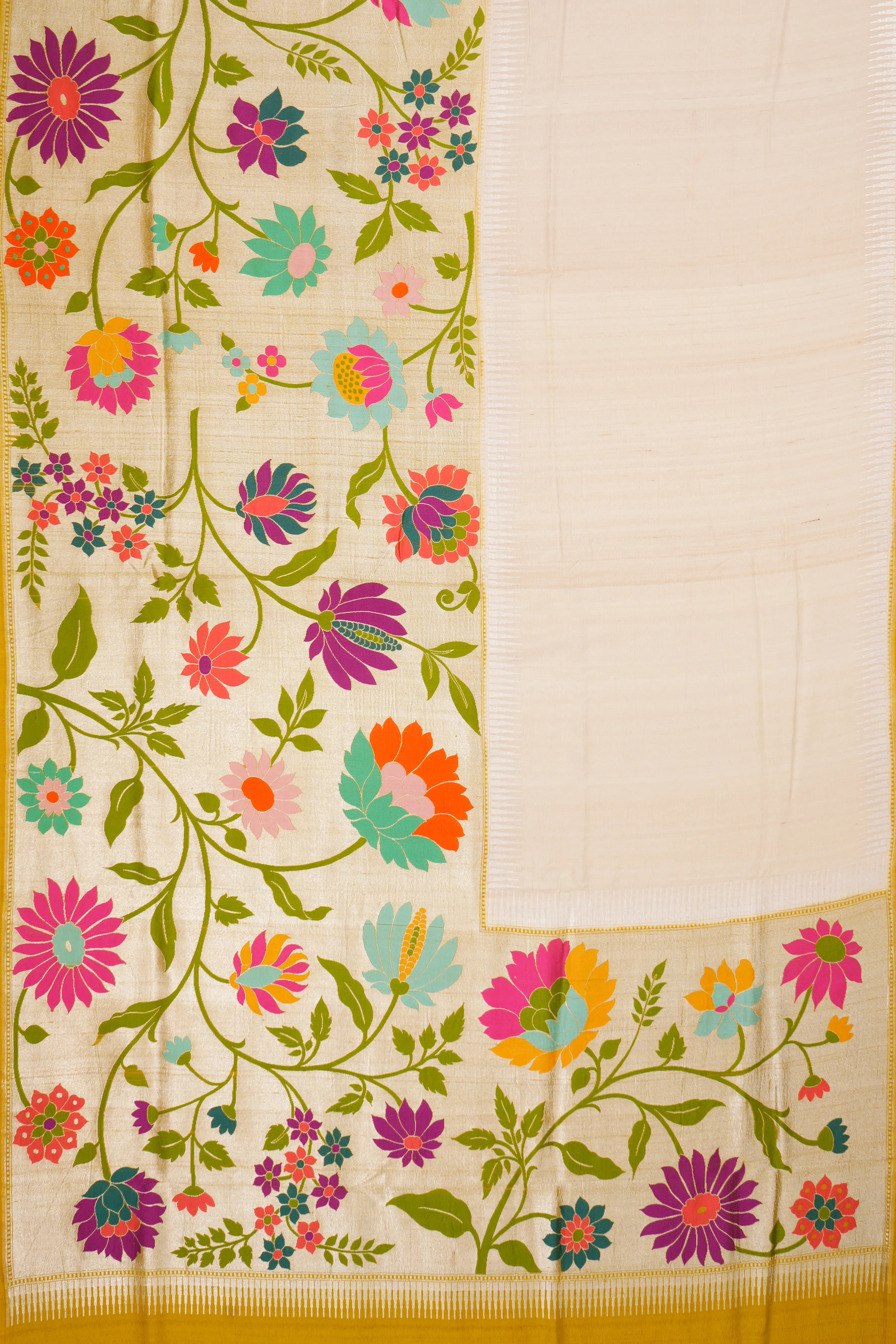 This elegant saree presents a plain off-white tussar silk body, offering a subtle and sophisticated backdrop to the detailed borders.