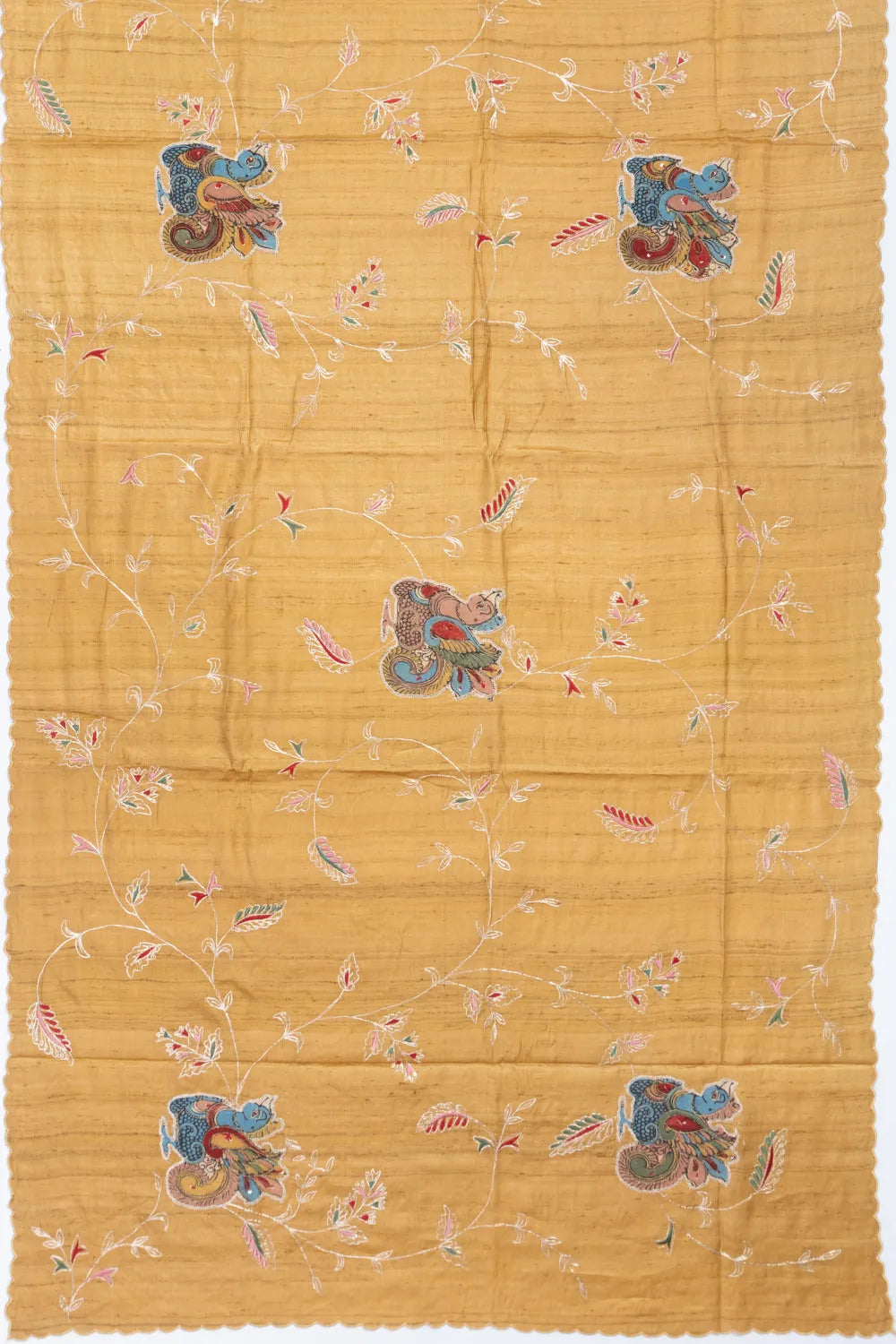Body: Rendered on a rich beige Tussar base, the saree features Kalamkari floral patches enhanced by Aari embroidery, with peacock motifs scattered throughout for a touch of nature’s elegance.