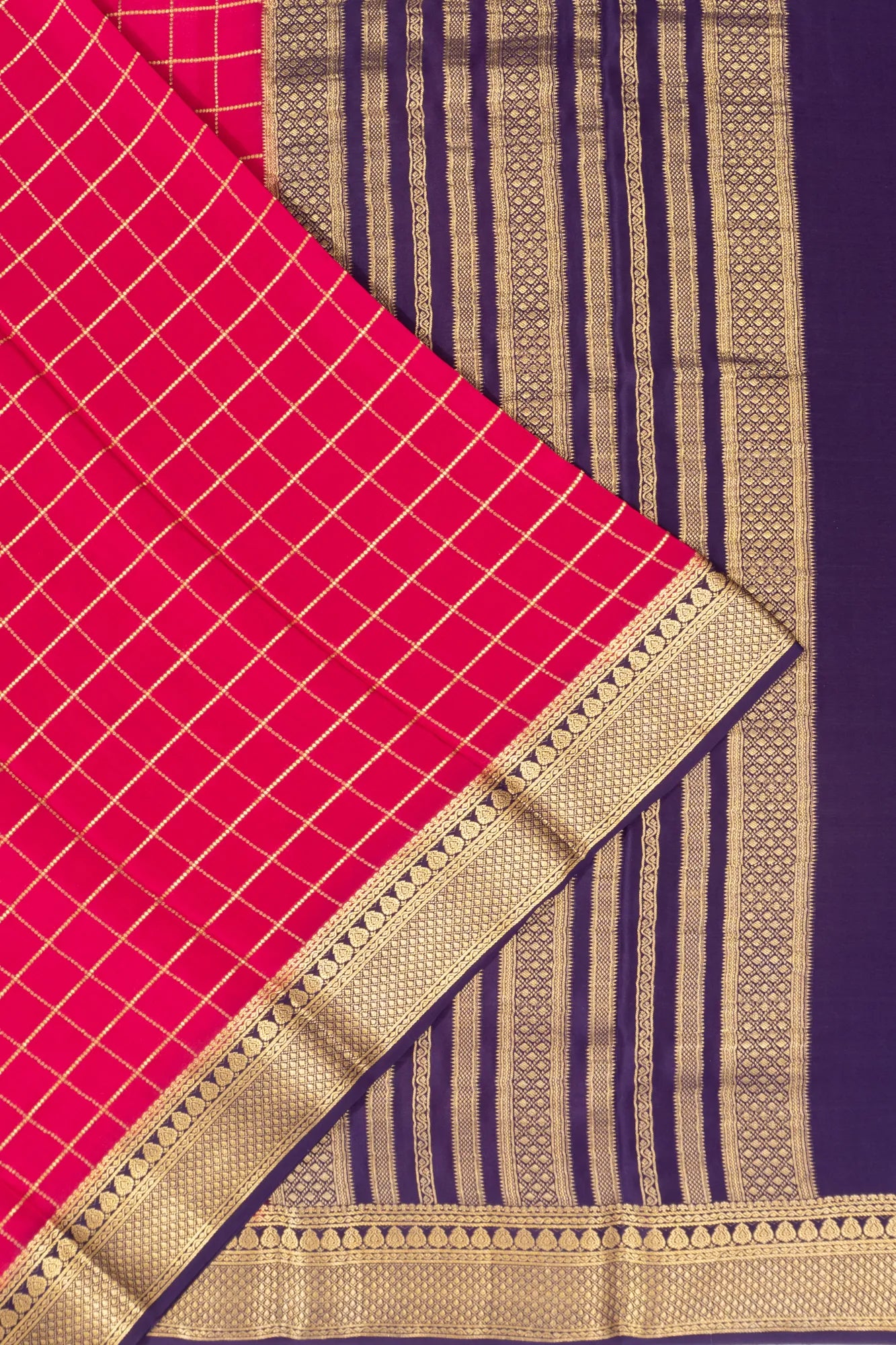 The body showcases elegant gold zari checks on a radiant pink base, creating a perfect blend of tradition and subtle grandeur.