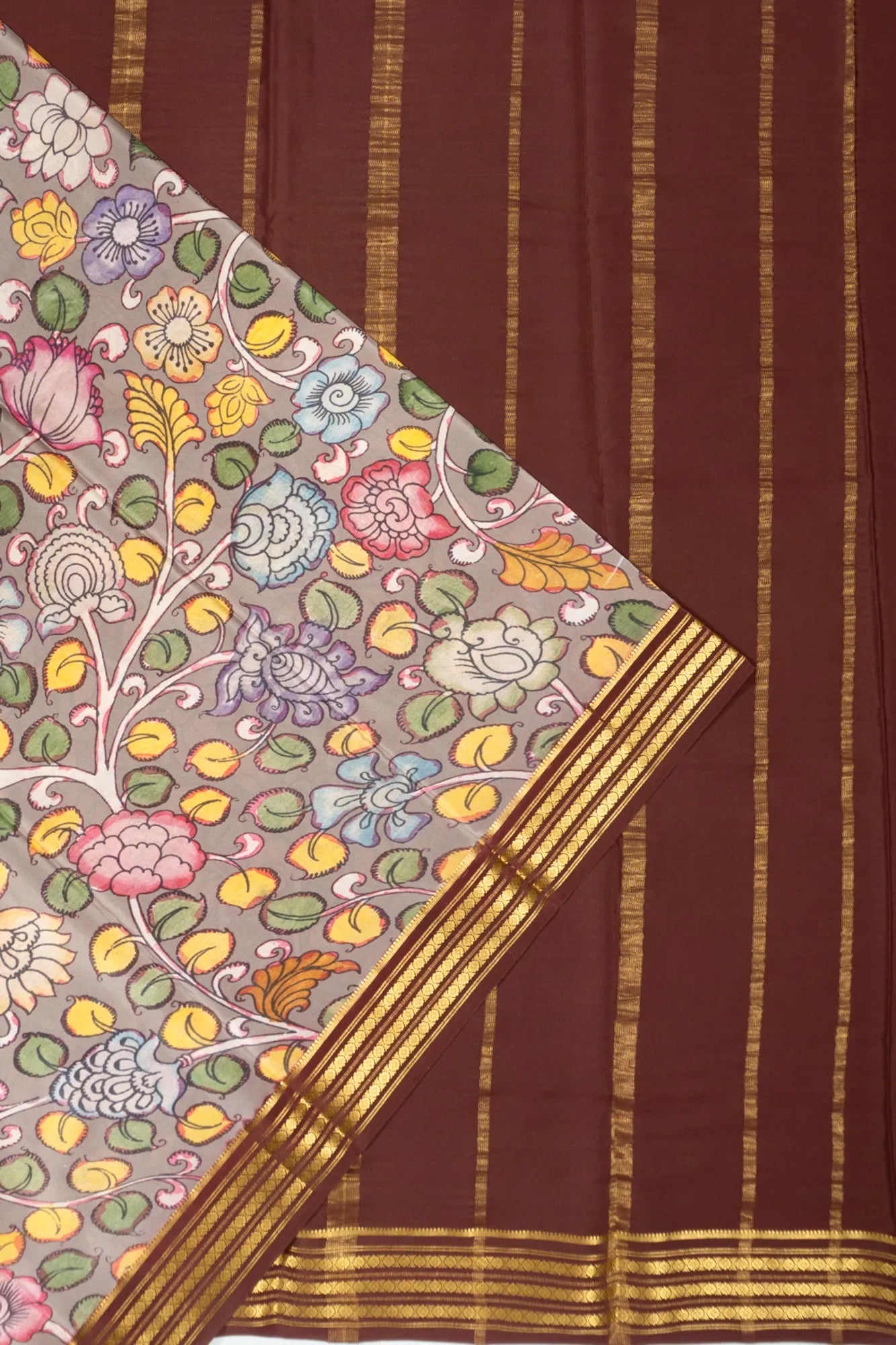 A harmonious brown border in gold zari floral brocade frames the saree, providing a luxurious touch that enhances its classical appeal