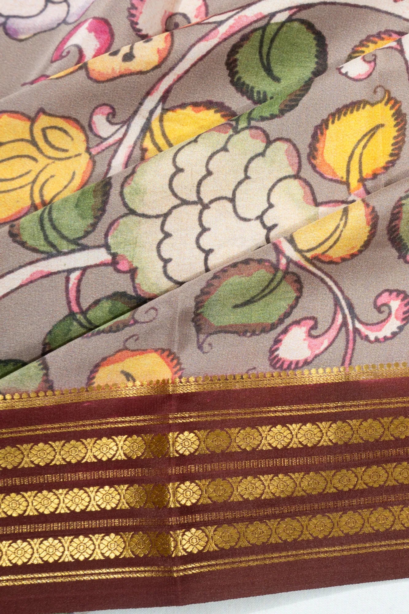 Minor irregularities in the zari border and a slight natural odor are characteristic of authentic Kalamkari sarees, resulting from traditional dyeing and weaving methods.